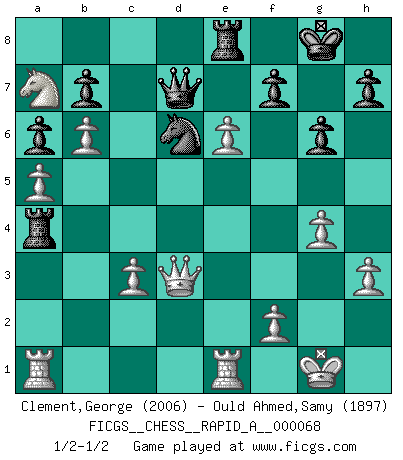 Last move : 1/2-1/2 2009 November 19 18:2:50 [Event "FICGS__CHESS__RAPID_A__000068"] [Site "FICGS"] [Date "2009.09.01"] [Round "1"] [White "Clement,George"] [Black "Ould Ahmed,Samy"] [Result "1/2-1/2"] [WhiteElo "2006"] [BlackElo "1897"] 1.e4 c5 2.Nf3 d6 3.Bb5+ Bd7 4.Bxd7+ Qxd7 5.d4 cxd4 6.Qxd4 Nc6 7.Qd3 g6 8.O-O Bg7 9.Nc3 Nf6 10.h3 O-O 11.Rd1 Rfd8 12.Nd5 Rac8 13.Nxf6+ Bxf6 14.c3 Bg7 15.Be3 Na5 16.Bd4 Nc4 17.Bxg7 Kxg7 18.b3 Nb6 19.Nd4 Qe8 20.Nb5 a6 21.Na7 Rc5 22.b4 Rc4 23.a4 d5 24.a5 Nc8 25.exd5 Nd6 26.b5 Ra8 27.b6 Qd7 28.Re1 Re8 29.Re5 Kg8 30.g4 Ra4 31.R5e1 e5 32.dxe6 1/2-1/2 Sicilian : Canal-Sokolsky attack, 3...Bd7 Kingside Castling by player White (move 8) Kingside Castling by player Black (move 10) This chess game ended in a draw. Follow this game move after move (download)In Chess, as it is played by masters, chance is practically eliminated. (Emanuel Lasker) Er war ein guter Schachspieler, aber ich kann Leute nicht ausstehen, die 'Heil Hitler' rufen (Über Alexander Aljechin). (Miguel Najdorf) Nada excita más a Grandes Maestros aburridos que una novedad teórica. (Dominic Lawson) Votre prénom est 'Tactique', votre deuxième prénom est 'Tactique' et votre nom est 'Tactique'. (Ken Smith) The message for business people contemplating their place in the cyberspace is simple and direct: get linked or get lost. (Vic Sussman and Kenan Pollack)