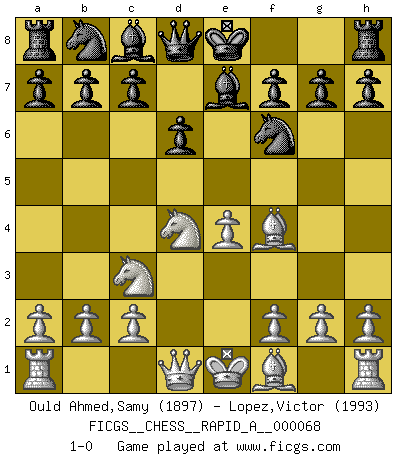 Last move : 1-0 2009 October 17 21:23:12 [Event "FICGS__CHESS__RAPID_A__000068"] [Site "FICGS"] [Date "2009.09.01"] [Round "1"] [White "Ould Ahmed,Samy"] [Black "Lopez,Victor"] [Result "1-0"] [WhiteElo "1897"] [BlackElo "1993"] 1.e4 e5 2.Nf3 d6 3.d4 exd4 4.Nxd4 Nf6 5.Nc3 Be7 6.Bf4 1-0 This chess game has been lost on time (started : 2009.09.01 23:10:28) Philidor : Exchange variation Player White won this chess game. Follow this game move after move (download)Without error there can be no brilliancy. (Emanuel Lasker) Ich kämpfe solange mein Gegner einen Fehler machen kann. (Emanuel Lasker) Debió haber existido una vez en que los hombres eran semidióses, de otra manera no hubiesen podido inventar el Ajedrez. (Gustav Schenk) Si le désir cupide (et stupide) de gagner est une inépuisable source de souffrance, une combinaison brillante sur l'échiquier est une découverte : le coquelicot qui s'épanouit lorsque apparaît la Voie Lactée. (Arrabal) Always be a first-rate version of yourself, instead of a second-rate version of somebody else. (Judy Garland)
