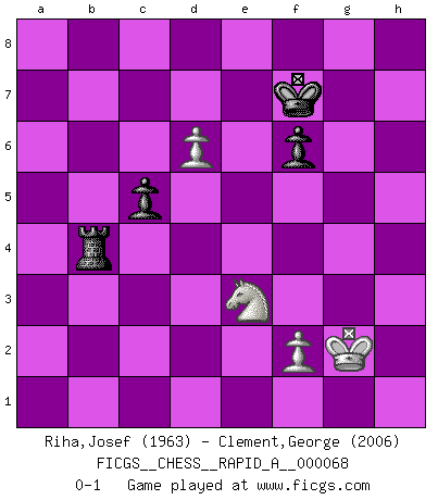 Last move : 0-1 2009 September 16 23:43:28 [Event "FICGS__CHESS__RAPID_A__000068"] [Site "FICGS"] [Date "2009.09.01"] [Round "1"] [White "Riha,Josef"] [Black "Clement,George"] [Result "0-1"] [WhiteElo "1963"] [BlackElo "2006"] 1.c4 e5 2.g3 Nf6 3.Nc3 Bc5 4.Bg2 Nc6 5.Nf3 d6 6.O-O O-O 7.d3 h6 8.a3 a5 9.h3 Be6 10.e3 e4 11.Ne1 exd3 12.b3 Qd7 13.g4 d2 14.Qxd2 h5 15.g5 Nh7 16.h4 Ne5 17.Na4 Ba7 18.Bb2 Ng6 19.c5 Nxh4 20.Qd4 Nf5 21.Qc3 d5 22.Rd1 Qe7 23.Bxd5 Rad8 24.Bxe6 Qxe6 25.Rxd8 Rxd8 26.Qe5 Nxg5 27.Qxe6 Nxe6 28.b4 axb4 29.axb4 Ng5 30.Bc3 c6 31.Kg2 h4 32.Rh1 Bb8 33.Nf3 h3+ 34.Rxh3 Nxh3 35.Kxh3 f6 36.Nb2 Kf7 37.Nc4 g5 38.Na5 Bc7 39.Nxb7 Rd3 40.Bd4 Ra3 41.Kg2 g4 42.Nh2 Rd3 43.Nxg4 Nxd4 44.exd4 Rxd4 45.Ne3 Rxb4 46.Nd6+ Bxd6 47.cxd6 c5 0-1 English Opening Kingside Castling by player White (move 6) Kingside Castling by player Black (move 6) 10 pieces endgame at move 45 : White KNNPP , Black KRBPP WHITE : King + 2 Knights 2 Pawns BLACK : King + 1 Rook 1 Bishop 2 Pawns 9 pieces endgame at move 46 : White KNPP , Black KRBPP WHITE : King + 1 Knight 2 Pawns BLACK : King + 1 Rook 1 Bishop 2 Pawns 8 pieces endgame at move 47 : White KNPP , Black KRPP WHITE : King + 1 Knight 2 Pawns BLACK : King + 1 Rook 2 Pawns Player Black won this chess game. Follow this game move after move (download)Those who say they understand Chess, understand nothing. (Robert Hubner) Jeder Schachmeister war einmal ein Anfänger. (Irving Chernev) Una de estas pequeñas movidas modestas pudieran ser mas molestas a tu oponente que la amenaza mas grande. (Siegbert Tarrasch) L'action d'une oeuvre littéraire se déroule sur un champ de bataille. Les masques et les types du drame moderne correspondent aux pièces du jeu d'échecs. L'intrigue correspond aux coups et aux gambits, c'est à dire aux techniques du jeu telles qu'utilisées et interprétées par les joueurs. Les tactiques et les péripéties [mouvements] correspondent aux coups exécutés par l'adversaire. (Viktor Shklovsky) Experience is the name we all give to our mistakes. (Oscar Wilde)