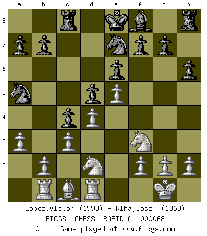 Last move : 0-1 2009 October 17 21:23:12 [Event "FICGS__CHESS__RAPID_A__000068"] [Site "FICGS"] [Date "2009.09.01"] [Round "1"] [White "Lopez,Victor"] [Black "Riha,Josef"] [Result "0-1"] [WhiteElo "1993"] [BlackElo "1963"] 1.e4 e6 2.d4 d5 3.e5 c5 4.c3 Nc6 5.Nf3 Bd7 6.a3 c4 7.Be2 Na5 8.Nbd2 Bc6 9.O-O Qd7 10.Qe1 Ba4 11.Bd1 h6 12.Rb1 Ne7 13.Bxa4 Qxa4 14.Qd1 Qxd1 15.Rxd1 Rc8 0-1 This chess game has been lost on time (started : 2009.09.01 23:10:28) French : Advance, Euwe variation Kingside Castling by player White (move 9) Player Black won this chess game. Follow this game move after move (download)Adequate compensation for a sacrifice is having a sound combination leading to a winning position; adequate compensation for a blunder is having your opponent snatch defeat from the jaws of victory. (Bruce A. Moon) Der Umstand, daß uns eine 7 Stunden Zeitkontrolle ermöglicht eine großartige, tiefe Partie zu spielen, ist für die Massenmedien nicht weiter von Bedeutung. (Alexej Shirov) Al jugar al Ajedrez entonces, podemos aprender: Primero: Previsión... Segundo: Prudencia... Tercero: Cautela... Y al final, aprendemos del Ajedrez el hábito de no ser desanimados por apariencias malas presentes en el estado de nuestros asuntos, el hábito de la esperanza por una oportunidad favorable y la perseveración de los secretos de los recursos. (Benjamin Franklin) Le jeu d'échecs est comme rejeté hors du temps. (Antoine de Saint-Exupéry) A mistake is only a mistake if you let it happen twice. Otherwise it is a learning experience. (Daniel Parmet)