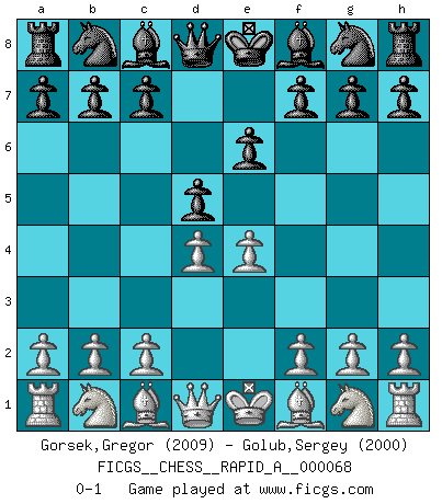 Last move : 0-1 2009 October 4 8:51:44 [Event "FICGS__CHESS__RAPID_A__000068"] [Site "FICGS"] [Date "2009.09.01"] [Round "1"] [White "Gorsek,Gregor"] [Black "Golub,Sergey"] [Result "0-1"] [WhiteElo "2009"] [BlackElo "2000"] 1.e4 e6 2.d4 d5 0-1 This chess game has been lost on time (started : 2009.09.01 23:10:28) French defense Player Black won this chess game. Follow this game move after move (download)First-class players lose to second-class players because second-class players sometimes play a first-class game. (Siegbert Tarrasch) Schach sollte überall auf der Welt Schulfach werden. Es fördert die geistige Auseinandersetzung. Es lehrt die Demut in der Niederlage. (Garry Kasparov) El Ajedrez es como la guerra en un tablero. (Bobby Fischer) Les Echecs mettent en conflit, non pas deux intelligences, mais deux volontés. (Lasker) Computers are like Old Testament gods; lots of rules and no mercy. (Joseph Campbell)