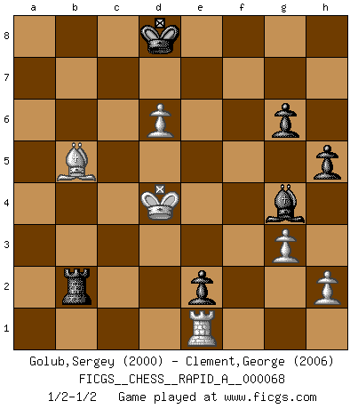 Last move : 1/2-1/2 2009 December 16 13:48:42 [Event "FICGS__CHESS__RAPID_A__000068"] [Site "FICGS"] [Date "2009.09.01"] [Round "1"] [White "Golub,Sergey"] [Black "Clement,George"] [Result "1/2-1/2"] [WhiteElo "2000"] [BlackElo "2006"] 1.d4 d5 2.c4 Nf6 3.cxd5 e6 4.dxe6 Bxe6 5.Nc3 c5 6.Nf3 Nc6 7.e3 Be7 8.Bb5 O-O 9.O-O Qb6 10.dxc5 Qxc5 11.Nd4 Nxd4 12.exd4 Qb6 13.Be3 Ng4 14.Qe2 a6 15.Bd3 Rac8 16.Rac1 g6 17.d5 Nxe3 18.Qxe3 Qxe3 19.fxe3 Bd7 20.Rfe1 Bc5 21.Kf2 f5 22.Kf3 Rfe8 23.g3 Re5 24.e4 Rce8 25.Rcd1 Kg7 26.Kg2 Bb4 27.a3 Bxc3 28.bxc3 fxe4 29.Be2 b5 30.c4 Rc8 31.Rd4 h5 32.Bf1 e3 33.cxb5 axb5 34.Kg1 Rc2 35.Rd3 e2 36.Bg2 Kf7 37.Kf2 Ra2 38.d6 Ke8 39.Re3 Rxe3 40.Kxe3 Rxa3+ 41.Kd4 Ra2 42.Bf3 Bg4 43.Bc6+ Kd8 44.Bxb5 Rb2 1/2-1/2 QGD : Marshall defense Kingside Castling by player Black (move 8) Kingside Castling by player White (move 9) This chess game ended in a draw. Follow this game move after move (download)Blessed be the memory of him who gave the world this immortal game. (A. G. Gardiner) Es ist nicht das erste mal, dass sich die FIDE dem Arabischen Geld gebeugt hat (über die FIDE WM 2004 in Lybien). (Larry Evans) Las ideas audaces son como las piezas del Ajedrez que avanzan hacia adelante. Ellas pueden ser vencidas, pero también pueden iniciar una partida victoriosa. (Goethe) Nous vivons dans un monde échiquéen : chaque jour qui passe est un défi à relever. (Philosophe Sasha) Wisdom is the reward you get for a lifetime of listening when you'd have preferred to talk. (Doug Larson)
