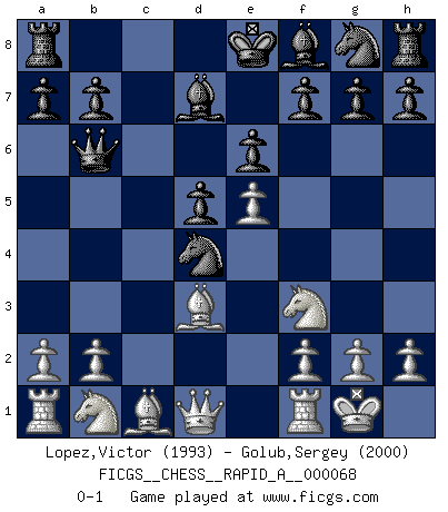 Last move : 0-1 2009 October 14 9:4:39 [Event "FICGS__CHESS__RAPID_A__000068"] [Site "FICGS"] [Date "2009.09.01"] [Round "1"] [White "Lopez,Victor"] [Black "Golub,Sergey"] [Result "0-1"] [WhiteElo "1993"] [BlackElo "2000"] 1.e4 e6 2.d4 d5 3.e5 c5 4.c3 Nc6 5.Nf3 Qb6 6.Bd3 cxd4 7.cxd4 Bd7 8.O-O Nxd4 0-1 This chess game has been lost on time (started : 2009.09.01 23:10:28) French : Advance, Milner-Barry gambit Kingside Castling by player White (move 8) Player Black won this chess game. Follow this game move after move (download)A Chess game is divided into three stages: the first, when you hope you have the advantage, the second when you believe you have an advantage, and the third... when you know you're going to lose ! (Savielly Tartakower) Offener Brief an US-Präsident Bush anlässlich der Verhaftung Bobby Fishers: Verhaften Sie mich. Stecken Sie mich in dieselbe Zelle wie Bobby Fisher und geben Sie uns ein Schachspiel mit. (Boris Vassilievich Spassky) En manos de Fischer's, una diminuta ventaja teórica es tan buena como tener una Reina de ventaja. (Isaac Kashdan) La guerre est enfant de la passion, la passion est enfant du narcissisme et le narcissisme est l'enfant. (...) Une autre partie ? (Thibault de Vassal) The next best thing to gambling and winning is gambling and loosing. (Nick Dandalos)