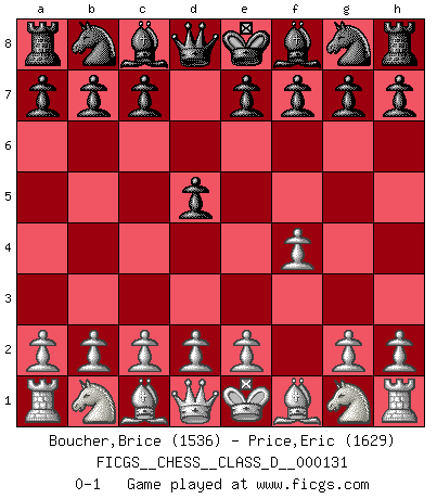 Last move : 0-1 2009 October 14 9:4:39 [Event "FICGS__CHESS__CLASS_D__000131"] [Site "FICGS"] [Date "2009.09.02"] [Round "1"] [White "Boucher,Brice"] [Black "Price,Eric"] [Result "0-1"] [WhiteElo "1536"] [BlackElo "1629"] 1.f4 d5 0-1 This chess game has been lost on time (started : 2009.09.02 2:3:14) Bird's Opening Player Black won this chess game. Follow this game move after move (download)There is only one thing Fischer does in Chess without pleasure: to lose ! (Boris Spassky) Im Internet Chess Club betrug mein Rating vorübergehend 3350 ELO-Punkte. (Sergej Karjakin) El Ajedrez expande y enriquece tu mente. (Saudin Robovic) Lorsque vous vous retrouvez devant une position atroce, ne tendez pas un ultime piège dérisoire avec l'intention d'abandonner si l'adversaire le déjoue ! Faites-vous plutôt un devoir de résister comme si votre vie en dépendait. Jouez le coup qui vous déplairait au centuple si vous étiez dans la peau de votre tortionnaire ! I've never seen so many men wasted so badly. (Blondie in The Good, The Bad and The Ugly)