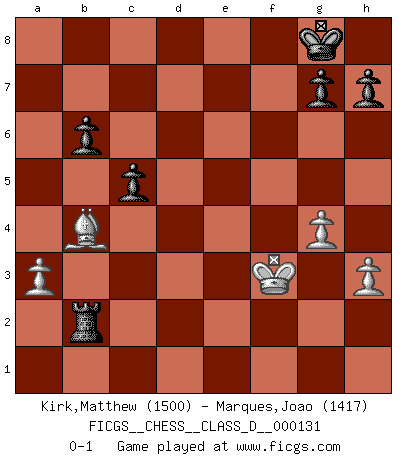 Last move : 0-1 2009 November 24 20:22:58 [Event "FICGS__CHESS__CLASS_D__000131"] [Site "FICGS"] [Date "2009.09.02"] [Round "1"] [White "Kirk,Matthew"] [Black "Marques,Joao"] [Result "0-1"] [WhiteElo "1500"] [BlackElo "1417"] 1.e4 e5 2.f4 exf4 3.Nf3 Bc5 4.d4 Bb6 5.Bxf4 d6 6.Nc3 Nf6 7.Bc4 O-O 8.O-O Bg4 9.h3 Bh5 10.g4 Bg6 11.Qd3 Re8 12.Rae1 Nc6 13.Kg2 d5 14.Bb5 dxe4 15.Nxe4 Nxe4 16.Ne5 Nxe5 17.Bxe5 Nd6 18.Qb3 Nxb5 19.Qxb5 Bxc2 20.Rxf7 Re7 21.Rxe7 Qxe7 22.Qc4+ Qf7 23.Qxc2 Qd5+ 24.Qe4 Qxe4+ 25.Rxe4 Re8 26.a3 Bxd4 27.Bxd4 Rxe4 28.Bxa7 Re2+ 29.Kf3 Rxb2 30.Bc5 b6 31.Bb4 c5 0-1 King's knight's gambit Kingside Castling by player Black (move 7) Kingside Castling by player White (move 8) Player Black won this chess game. Follow this game move after move (download)There are two classes of men; those who are content to yield to circumstances and who play whist; those who aim to control circumstances, and who play Chess. (Mortimer Collins) Fischer machte Schach einfach zu einer aufregenden Sache, wann immer er sich ans Brett setzte. (Raymond Keene) Una de estas pequeñas movidas modestas pudieran ser mas molestas a tu oponente que la amenaza mas grande. (Siegbert Tarrasch) Ce n'est pas pour s'amuser qu'il joue aux échecs : il célèbre un culte. (Vladimir Nabokov) The Movers & Shakers of this world are those who play chess in the mornings and go to the disco in the evenings. (Dinesh De Silva)
