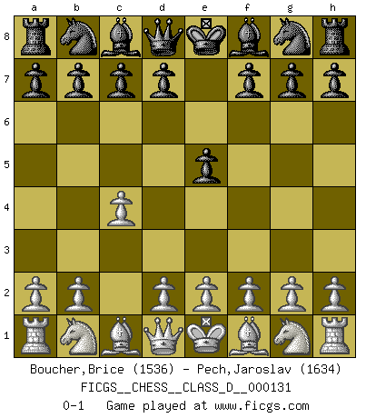 Last move : 0-1 2009 October 13 9:0:6 [Event "FICGS__CHESS__CLASS_D__000131"] [Site "FICGS"] [Date "2009.09.02"] [Round "1"] [White "Boucher,Brice"] [Black "Pech,Jaroslav"] [Result "0-1"] [WhiteElo "1536"] [BlackElo "1634"] 1.c4 e5 0-1 This chess game has been lost on time (started : 2009.09.02 2:3:14) English Opening Player Black won this chess game. Follow this game move after move (download)The beauty of a move lies not in its' appearance but in the thought behind it. (Siegbert Tarrasch) Bobby Fischer ist kein Vorbild für die heutige Jugend. (Viktor Kortschnoi) El jugador de combinación piensa hacia adelante; comienza de la posición dada y trabaja las movidas contundentes en su mente. (Emanuel Lasker) Vous n'êtes pas toujours obligé de jouer le meilleur coup. Un coup doit être actif, entreprenant, correct et beau ! (David Bronstein) For to win one hundred victories in one hundred battles is not the acme of skill. To subdue the enemy without fighting is the acme of skill. (Sun Tzu)