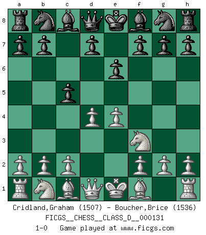 Last move : 1-0 2009 October 12 8:48:47 [Event "FICGS__CHESS__CLASS_D__000131"] [Site "FICGS"] [Date "2009.09.02"] [Round "1"] [White "Cridland,Graham"] [Black "Boucher,Brice"] [Result "1-0"] [WhiteElo "1507"] [BlackElo "1536"] 1.e4 c5 2.Nf3 e6 3.d4 1-0 This chess game has been lost on time (started : 2009.09.02 2:3:14) Sicilian defense Player White won this chess game. Follow this game move after move (download)I give 98 percent of my mental energy to Chess. Others give only 2 percent. (Bobby Fischer) Alles was am Schachbrett zählt sind gute Züge. (Robert James Fischer) Debemos de asegurarnos de que el Ajedrez no se convierta en un lenguaje muerto, muy interesante, pero tan solo para un grupo muy pequeño. (Sytze Faber) Mais n'est-ce pas déjà le limiter injurieusement que d'appeler les échecs un jeu? N'est-ce pas aussi une science, un art, ou quelque chose qui, comme le cercueil de Mahomet entre ciel et terre, est suspendu entre l'un et l'autre, et qui réunit un nombre incroyable de contraires ? (Stefan Zweig) Don't anthropomorphize computers - they hate it. (Anonymous)