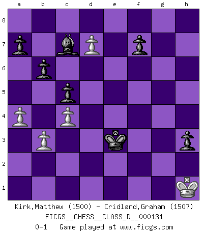 Last move : 0-1 2009 November 24 20:22:22 [Event "FICGS__CHESS__CLASS_D__000131"] [Site "FICGS"] [Date "2009.09.02"] [Round "1"] [White "Kirk,Matthew"] [Black "Cridland,Graham"] [Result "0-1"] [WhiteElo "1500"] [BlackElo "1507"] 1.e4 c5 2.Nc3 Nf6 3.f4 d5 4.d3 dxe4 5.dxe4 Qxd1+ 6.Kxd1 e5 7.fxe5 Ng4 8.Ke2 Nxe5 9.Nf3 Nxf3 10.gxf3 Be6 11.Nd5 Bxd5 12.exd5 Bd6 13.Be3 Nd7 14.c4 O-O 15.Rg1 Rae8 16.Kf2 Ne5 17.Bh6 Ng6 18.Be3 Bxh2 19.Rh1 Bd6 20.Bd3 Re7 21.Rae1 Rfe8 22.Bd2 Rxe1 23.Rxe1 Rxe1 24.Kxe1 Ne5 25.Ke2 Nxd3 26.Kxd3 h5 27.Ke2 h4 28.Kf2 h3 29.Kg1 Kh7 30.Kh1 Kg6 31.b3 Kf5 32.Be3 b6 33.a3 g5 34.Bg1 g4 35.fxg4+ Kxg4 36.a4 Kf3 37.Bh2 Be7 38.d6 Bd8 39.d7 Ke3 40.Bc7 Bxc7 0-1 Sicilian : Closed Kingside Castling by player Black (move 14) Player Black won this chess game. Follow this game move after move (download)Capture of the adverse King is the ultimate but not the first object of the game. (William Steinitz) Taktik ist was man tun muß, wenn etwas zu tun ist. Strategie ist was man tun muß, wenn nichts zu tun ist. (Savielly Grigorievitsch Tartakower) Tu cuerpo tiene que estar en óptima condición. Tu Ajedrez se deteriora como lo hace tu cuerpo. No puedes separar la mente y el cuerpo. (Bobby Fischer) Les ravages du H expliquent la différence de niveau entre Tal et Thal [Abergel]. Wikichess, chess moves explained by 'experimented' players. (Thibault de Vassal)