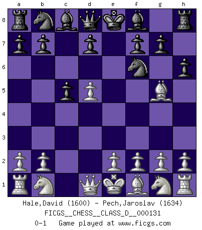 Last move : 0-1 2009 November 9 20:27:33 [Event "FICGS__CHESS__CLASS_D__000131"] [Site "FICGS"] [Date "2009.09.02"] [Round "1"] [White "Hale,David"] [Black "Pech,Jaroslav"] [Result "0-1"] [WhiteElo "1600"] [BlackElo "1634"] 1.d4 Nf6 2.c4 c5 3.d5 e6 4.Bg5 exd5 5.cxd5 h6 0-1 This chess game has been lost on time (started : 2009.09.02 2:3:14) Benoni defense Player Black won this chess game. Follow this game move after move (download)The Chess pieces are the block alphabet which shapes thoughts; and these thoughts, although making a visual design on the chessboard, express their beauty abstractly, like a poem. (Marcel Duchamp) Er war ein guter Schachspieler, aber ich kann Leute nicht ausstehen, die 'Heil Hitler' rufen (Über Alexander Aljechin). (Miguel Najdorf) El Ajedrez es 99 por ciento táctica. (Teichmann) Pour se monter efficace, un Cavalier a besoin d'avant-postes ! Les Cavaliers font les meilleurs bloqueurs de pions passés. They say poker is a zero-sum game. It must be, because every time I play my sum ends up zero. (Max Shapiro)