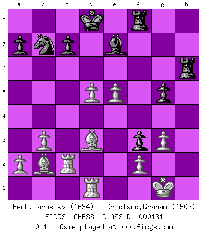 Last move : 0-1 2010 January 28 8:37:5 [Event "FICGS__CHESS__CLASS_D__000131"] [Site "FICGS"] [Date "2009.09.02"] [Round "1"] [White "Pech,Jaroslav"] [Black "Cridland,Graham"] [Result "0-1"] [WhiteElo "1634"] [BlackElo "1507"] 1.c4 Nf6 2.Nc3 e5 3.Nf3 Nc6 4.g3 d5 5.cxd5 Nxd5 6.Bg2 Be6 7.O-O f5 8.Qb3 Qd7 9.Qxb7 Rb8 10.Nxe5 Rxb7 11.Nxd7 Kxd7 12.Nxd5 Bxd5 13.Bxd5 Bc5 14.d4 Bd6 15.e3 Rb6 16.Bc4 g5 17.b3 Rf8 18.Bb2 f4 19.e4 Na5 20.Be2 f3 21.Bd3 Be7 22.Rfd1 Nb7 23.e5 h5 24.Rac1 h4 25.Rc2 hxg3 26.hxg3 Rh6 27.d5 Kd8 0-1 This chess game has been lost on time (started : 2009.09.02 2:3:14) English Opening Kingside Castling by player White (move 7) Player Black won this chess game. Follow this game move after move (download)My God, Bobby Fischer plays so simply. (Alexei Suetin) Ich glaube, ich kenne inzwischen die Gründe für mein Versagen: schachliche Charakterfehler. Ich war nie ein Wunderkind und in meiner gesamten menschlichen Entwicklung immer zu langsam. (Viktor Kortschnoi) Fischer sacrificó virtualmente todo lo que la mayoría de nosotros los 'debiles' (término que él usa) valoramos, respetamos y apreciamos por el amor de un astuto, a menudo hermoso tablero de juego, por el privilegio ambivalente de ser su mas grande maestro. (Paul Kollar) Le profane ne songe pas à la somme de jouissance dont il se prive, qui méconnaît ce jeu aux ressources aussi variées que passionnantes. (Jean-Marie Jeanton-Lamarche) A specialist learns more and more about less and less until he knows everything about nothing. (Nicholas Murray Butler)