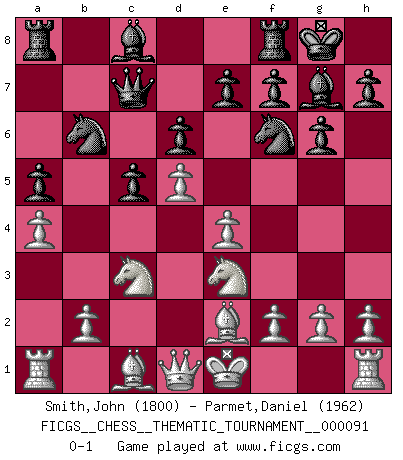 Last move : 0-1 2010 January 6 20:30:25 [Event "FICGS__CHESS__THEMATIC_TOURNAMENT__000091"] [Site "FICGS"] [Date "2009.09.02"] [Round "1"] [White "Smith,John"] [Black "Parmet,Daniel"] [Result "0-1"] [WhiteElo "1800"] [BlackElo "1962"] 1.d4 Nf6 2.c4 c5 3.d5 b5 4.Nf3 g6 5.cxb5 a6 6.b6 d6 7.Nc3 Nbd7 8.a4 Qxb6 9.e4 Bg7 10.Nd2 O-O 11.Nc4 Qc7 12.Be2 Nb6 13.Ne3 a5 0-1 This chess game has been lost on time (started : 2009.09.02 3:20:7) Benko gambit Kingside Castling by player Black (move 10) Player Black won this chess game. Follow this game move after move (download)In Chess, just as in life, today's bliss may be tomorrow's poison. (Assaic) Es gibt keine einzige Frau, der ich nicht einen Springer vorgeben könnte und trotzdem gewänne. (Robert James Fischer) La táctica fluye a partir de una posición superior. (Bobby Fischer) Les Echecs ont trois composantes : le temps, l'espace et le matériel en dernier. (Mikhail Tal) Everything in life is luck. (Donald Trump)