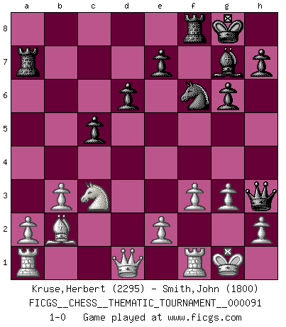 Last move : 1-0 2010 January 6 20:30:25 [Event "FICGS__CHESS__THEMATIC_TOURNAMENT__000091"] [Site "FICGS"] [Date "2009.09.02"] [Round "1"] [White "Kruse,Herbert"] [Black "Smith,John"] [Result "1-0"] [WhiteElo "2295"] [BlackElo "1800"] 1.d4 Nf6 2.c4 c5 3.d5 b5 4.cxb5 a6 5.bxa6 Bxa6 6.g3 d6 7.Bg2 g6 8.b3 Bg7 9.Bb2 O-O 10.Nh3 Nbd7 11.O-O Ra7 12.Nf4 Qa8 13.Ne6 fxe6 14.dxe6 Bb7 15.Bxb7 Qxb7 16.exd7 Qxd7 17.Nc3 Qh3 18.f3 1-0 This chess game has been lost on time (started : 2009.09.02 3:20:7) Benko gambit accepted Kingside Castling by player Black (move 9) Kingside Castling by player White (move 11) Player White won this chess game. Follow this game move after move (download)Who is your opponent tonight, tonight I am playing against the Black pieces. (Akiba Rubinstein) Schach wird sich dank seiner hohen kulturellen Tradition immer durchsetzen. In näherer Zukunft womöglich sogar als Gegenreaktion auf die maßlose Reizüberflutung im Freizeit- und Spielbereich. (Garry Kasparov) Muchos se han convertido en Maestros de Ajedrez, nadie se ha convertido en el Maestro del Ajedrez. (Siegbert Tarrasch) Je fais ceci parce que dans cinquante coups j'obtiendrai cela; je m'appelle Mikhail Moisevitch Botvinnik. (Botvinnik) In fact if nothing is done against this teddy bear, hereby I announce that I would quit chess, rapid chess, blitz chess, postal chess, email chess, server chess and correspondence chess I will then switch to a table game where teddy bears aren't going to be seen for a while, like Poker, or Roulette, all 18+ games. (Elmer Valderrama)
