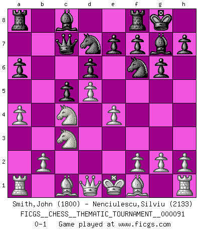 Last move : 0-1 2010 January 11 8:39:23 [Event "FICGS__CHESS__THEMATIC_TOURNAMENT__000091"] [Site "FICGS"] [Date "2009.09.02"] [Round "1"] [White "Smith,John"] [Black "Nenciulescu,Silviu"] [Result "0-1"] [WhiteElo "1800"] [BlackElo "2133"] 1.d4 Nf6 2.c4 c5 3.d5 b5 4.Nf3 g6 5.cxb5 a6 6.b6 d6 7.Nc3 Nbd7 8.a4 Qxb6 9.e4 Bg7 10.Nd2 O-O 11.Nc4 Qc7 0-1 This chess game has been lost on time (started : 2009.09.02 3:20:7) Benko gambit Kingside Castling by player Black (move 10) Player Black won this chess game. Follow this game move after move (download)A man without frontiers. He didn't divide the East and the West, he brought them together in their admiration for him. (Ljubomir Ljubojevic, about Bobby Fischer's death) Schach ist ein Teil der Kultur, und wenn es mit der Kultur abwärts geht, geht es auch mit dem Schach abwärts. (Mikhail Moiseyevich Botvinik) El Ajedrez es un expediente tonto que hace creer a la gente inactiva que hacen una cosa muy astuta cuando solamente estan perdiendo su tiempo. (George Bernard Shaw) On entre au jeu d'Echecs comme on entre en Religion. Pour le joueur d'Echecs, la partie d'Echecs c'est l'office, la messe, le défilé du 1er Mai, le dépôt de gerbe au Monument aux Morts. C'est un drame sacré. (Michel Roos) To err is human, to shift the blame on someone else is tactical. (Mladen Jankovic)