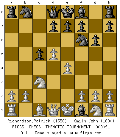 Last move : 0-1 2009 October 2 0:2:51 [Event "FICGS__CHESS__THEMATIC_TOURNAMENT__000091"] [Site "FICGS"] [Date "2009.09.02"] [Round "1"] [White "Richardson,Patrick"] [Black "Smith,John"] [Result "0-1"] [WhiteElo "1550"] [BlackElo "1800"] 1.d4 Nf6 2.c4 c5 3.d5 b5 4.cxb5 a6 5.bxa6 Bxa6 6.Nc3 g6 7.e4 Bxf1 0-1 Benko gambit accepted Player Black won this chess game. Follow this game move after move (download)On the chessboard, lies and hypocrisy do not survive long. (Emanuel Lasker) Mein Name ist Rustam Kamsky. Sie haben meinen Sohn belästigt. Bereiten Sie sich aufs Sterben vor. (Rustam Kamsky) Yo siempre he tenido un ligero sentimiento de lástima por una persona que no tiene conocimiento del Ajedrez. (Siegbert Tarrasch) En blitz, le Cavalier l'emporte sur le Fou. (Vlastimil Hort) Inventor: A person who makes an ingenious arrangement of wheels, levers and springs, and believes it civilization. (Ambrose Bierce, The Devil's Dictionary)