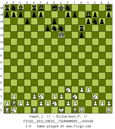 Last move : 1-0 2009 September 11 18:55:19 [Event "FICGS__BIG_CHESS__TOURNAMENT__000048"] [Site "FICGS"] [Date "2009.09.02"] [Round "1"] [White "Vaast,Jean-Philippe"] [Black "Richardson,Patrick"] [Result "1-0"] [WhiteElo ""] [BlackElo ""] 1.j2-k4 p16-o14 2.b2-b3 n15-n14 3.c1-b2 o16-n15 4.p1-o3 j15-k13 5.e2-e3 d15-d14 6.m2-m4 m15-m13 7.h1-p8 p15-p14 8.f1-b5 l16-m15 9.n2-n4 g15-g13 10.o1-f9 g16-j15 11.p8-o9 m13-m12 12.g1-f3 j15-h13 13.k1-l3 h15-j13 14.f9-k13 m15-k13 15.b5-k13 j14-k13 16.o9-k13 m16-m13 17.k13-j12 1-0 Follow this game move after move (download)We don't really know how the game was invented, though there are suspicions. As soon as we discover the culprits, we'll let you know. (Bruce Pandolfini) Ich verstehe mehr vom Schach als irgendein anderer lebender Meister. (José Raúl Capablanca) ¿Esta Bobby Fischer algo cuerdo?. (Salo Flohr) Dans le domaine de la peinture, de la gravure et de la sculpture, dès la première décennie de notre siècle, les artistes abandonnent la représentation de la partie d'échecs pour se concentrer sur les pièces, sur les échiquiers et sur toutes les variations auxquelles les unes et les autres peuvent donner lieu. On passe en quelque sorte d'un thème social à un thème musical (au sens de la musica médiévale, c'est-à-dire d'une notion qui inclue le rythme, l'harmonie, la construction et la déconstruction, etc.). Graphiquement et picturalement, l'échiquier apparaît comme une structure ouverte, dynamique, d'une richesse infinie, autorisant toutes les combinatoires et débouchant sur des mouvements et des rythmes de nature exponentielle. (Michel Pastoureau) Quotation,n.: The act of repeating erroneously the words of another. The words erroneously repeated. (Ambrose Bierce, The Devil's Dictionary)