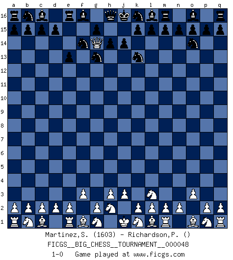 Last move : 1-0 2009 September 12 19:15:27 [Event "FICGS__BIG_CHESS__TOURNAMENT__000048"] [Site "FICGS"] [Date "2009.09.02"] [Round "1"] [White "Martinez,Silvio"] [Black "Richardson,Patrick"] [Result "1-0"] [WhiteElo "1603"] [BlackElo ""] 1.j2-l3 j15-k13 2.h1-o7 p16-o14 3.o7-f15 g16-f14 4.o2-o3 e15-e13 5.f2-f3 h15-g13 6.f15-g14 1-0 Follow this game move after move (download)After black's reply to 1.e4 with 1..e5, leaves him always trying to get into the game. (Howard Staunton) Kann Schach nicht schließlich das Nationalspiel der Deutschen werden? Und welche weiteren Ausblicke bieten sich dann dar! Welche Hebung des allgemeinen Kultur-Niveaus, ja der Moral, wenn das Schachbrett den Kartentisch verdrängen würde! Wahrlich, ein Ziel, des Schweißes der Edlen wert! (Siegbert Tarrasch) El Ajedrez era la lengua materna de Capablanca. (Reti) A chaque perte on perd un peu de soi. (Joël Lautier) Computers are like Old Testament gods; lots of rules and no mercy. (Joseph Campbell)