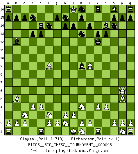 Last move : 1-0 2009 December 4 20:57:20 [Event "FICGS__BIG_CHESS__TOURNAMENT__000048"] [Site "FICGS"] [Date "2009.09.02"] [Round "1"] [White "Staggat,Rolf"] [Black "Richardson,Patrick"] [Result "1-0"] [WhiteElo "1713"] [BlackElo ""] 1.j2-k4 j15-k13 2.h1-o7 p16-o14 3.o7-f15 g16-f14 4.d2-d4 d15-d13 5.f15-o7 c16-k9 6.e2-e4 e15-e13 7.m2-m4 m15-m13 8.n2-n4 n15-n13 9.f1-b5 l16-n14 10.o1-f9 l15-l14 11.l1-p5 f16-b12 12.c1-l9 b16-d15 13.b1-c3 h16-m12 14.g1-f3 e16-e14 15.o7-p6 1-0 Follow this game move after move (download)You sit at the board and suddenly your heart leaps. Your hand trembles to pick up the piece and move it. But what Chess teaches you is that you must sit there calmly and think about whether it's really a good idea and whether there are other better ideas. (Stanley Kubrick) Schach ist Krieg, im Schach geht es um testosterongesteuerte Urschreie. (Garry Kasparov) En el Ajedrez, cuando menos, el valiente hereda la tierra. (Edmar Mednis) Les Echecs ne sont pas pour les âmes timides. Ils requièrent un homme entier, qui ne s'arrête pas aveuglément à ce qui a été déjà établi, mais qui tente individuellement de sonder les profondeurs du jeu. (W. Steinitz) Life is painting a picture, not doing a sum. (Oliver Wendell Holmes, Jr.)