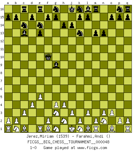 Last move : 1-0 2009 November 14 20:53:14 [Event "FICGS__BIG_CHESS__TOURNAMENT__000048"] [Site "FICGS"] [Date "2009.09.02"] [Round "1"] [White "Jerez,Miriam"] [Black "Farahmi,Andi"] [Result "1-0"] [WhiteElo "1539"] [BlackElo ""] 1.g2-g4 j15-k13 2.h1-c6 e15-e13 3.c6-c15 b16-c14 4.o2-o3 h15-g13 5.l2-l3 g13-e14 6.c15-c16 a16-c16 7.c2-c3 h16-o10 8.h3-h4 n15-n13 9.d2-d4 o16-d6 10.e2-e4 m15-m13 11.j2-g3 f16-c13 12.e4-e5 d6-g9 13.n2-n3 o10-f10 14.p1-n2 1-0 This big chess game has been lost on time (started : 2009.09.02 12:14:44) Follow this game move after move (download)Fischer sacrificed virtually everything most of us weakies (to use his term) value, respect, and cherish, for the sake of an artful, often beautiful board game, for the ambivalent privilege of being its greatest master. (Paul Kollar) Es gibt keine einzige Frau, der ich nicht einen Springer vorgeben könnte und trotzdem gewänne. (Robert James Fischer) El Ajedrez es una hermosa aventura. (Bent Larsen) Avec des compensations pour le matériel en plus... (Anonyme) Before all elsed, be armed. (Niccolo Machiavelli)