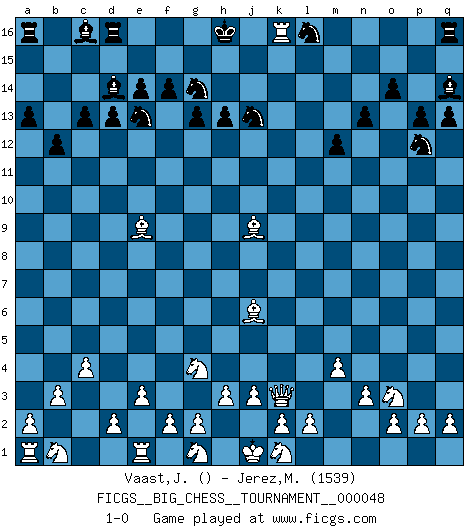 Last move : 1-0 2009 November 21 0:50:50 [Event "FICGS__BIG_CHESS__TOURNAMENT__000048"] [Site "FICGS"] [Date "2009.09.02"] [Round "1"] [White "Vaast,Jean-Philippe"] [Black "Jerez,Miriam"] [Result "1-0"] [WhiteElo ""] [BlackElo "1539"] 1.h2-g4 g15-g13 2.j2-k4 o15-o14 3.b2-b3 h16-c11 4.c2-c4 l15-l14 5.c1-b2 c15-c14 6.h1-o7 h14-h13 7.p1-o3 f15-f14 8.m2-m4 d15-d13 9.l1-m2 p15-p13 10.k4-l6 m15-m13 11.m2-c11 l16-q11 12.e2-e3 q11-l6 13.f1-d3 p16-q14 14.n2-n3 q14-p12 15.o1-j6 q15-q13 16.o7-p6 n15-n13 17.p6-l6 b16-d15 18.m1-m3 d15-e13 19.m3-k3 e15-e14 20.l6-k5 m13-m12 21.k5-k15 j16-h16 22.k15-k8 f16-d14 23.b2-j9 j15-g14 24.q1-m1 b15-b13 25.m1-m3 c14-c13 26.m3-l3 e16-d16 27.d3-n12 o16-q14 28.n12-l14 k16-l14 29.l3-l14 m16-k16 30.k8-e8 k16-k3 31.e8-k3 g16-j15 32.l14-j14 b13-b12 33.c11-g7 h15-j13 34.j14-k14 a15-a13 35.g7-e9 j15-l16 36.k14-k16 1-0 Follow this game move after move (download)It began to feel as though you were playing against Chess itself. - On playing against Robert Fischer. (Walter Shipman) Es tut gut, die Entwicklungsperiode von, [...] demokratischem Geist durchdringen zu lassen. Wie undemokratisch wäre es doch beispielsweise, den einen Offizier große Spaziertouren vornehmen zu lassen, während die anderen zu Hause säßen und sich entsetzlich langweilten. (Aaron Nimzowitsch) Las combinaciones han sido siempre el aspecto más intrigante del Ajedrez. Los Maestros las buscan, el público las aplauden, los críticos las alaban. La razón se debe a que las combinaciones hacen posible que el Ajedrez sea más que un ejercicio matemático con una carencia de vida. Ellas son la poesía del juego, son del Ajedrez lo que la melodía es de la música. Ellas representan el triunfo de la mente sobre la materia. (Reuben Fine) Vous m'avez demandé de vous exposer quel est le fondement de la prière. Je ne fais que préparer les pièces du jeu sur la table... Nous sera-t-il permis d'en adopter les règles et si nous les appliquons scrupuleusement nous ne tarderons pas à faire mat le Roi divin ! Il ne pourra échapper à nos mains. (Sainte Thérèse d'Avila, Chemin de perfection) Just because you do not take an interest in politics doesn't mean politics won't take an interest in you. (Pericles 430 B.C.)