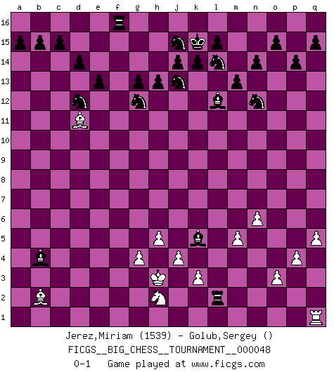 Last move : 0-1 2010 February 20 18:51:44 [Event "FICGS__BIG_CHESS__TOURNAMENT__000048"] [Site "FICGS"] [Date "2009.09.02"] [Round "1"] [White "Jerez,Miriam"] [Black "Golub,Sergey"] [Result "0-1"] [WhiteElo "1539"] [BlackElo ""] 1.g2-g4 g15-g13 2.c2-c3 p15-p14 3.j2-l3 h16-d12 4.o2-o3 o16-p15 5.h1-o7 p16-o14 6.o7-f15 g16-f14 7.n2-n3 b16-c14 8.e2-e3 d15-d14 9.b2-b3 h14-h13 10.f15-a10 f16-j13 11.f1-c4 m15-m13 12.c1-a3 n15-n14 13.d2-d4 o14-n12 14.b1-d2 l16-m15 15.n3-n4 m15-j12 16.m2-m4 k16-l14 17.l1-o4 e15-e13 18.p1-q3 c16-e14 19.a10-f5 e16-f16 20.q3-p5 f14-e12 21.f5-d5 f16-f2 22.d2-f3 a16-f16 23.d5-d12 c14-d12 24.o4-l7 f2-c2 25.g1-e2 j12-l10 26.e1-d1 j13-m10 27.d4-d5 m10-e3 28.h2-f1 e3-l9 29.p5-n6 e14-n6 30.m4-m5 n6-m7 31.j3-j4 f16-f3 32.h3-h4 k15-k14 33.k1-h2 f3-f2 34.h4-h5 f2-e2 35.c4-e2 c2-e2 36.d1-e1 e2-e1 37.a1-e1 e12-f14 38.f1-g3 p15-c3 39.e1-f1 j16-k15 40.p2-p4 m16-f16 41.f1-f3 c3-e5 42.f3-c3 e5-c3 43.q2-q4 f14-g12 44.q4-q5 l10-b1 45.j1-j2 b1-a2 46.b3-b4 a2-d5 47.g3-e2 c3-g7 48.e2-c3 g7-c3 49.m1-d1 d5-l12 50.d1-c1 l9-c1 51.a3-c1 c3-b4 52.o1-d11 h15-j13 53.c1-b2 q16-h16 54.n4-n5 f16-f7 55.k2-k3 f7-l7 56.l3-k5 l7-l2 57.j2-h3 h16-f16 58.n5-n6 m7-k5 0-1 Follow this game move after move (download)Fischer is completely natural. He plays no roles. He's like a child. Very, very simple. (Zita Rajcsanyi) Ich kenne Menschen, die allen Willen der Welt besitzen und doch nicht Schach spielen können. (Robert James Fischer) El Ajedrez demanda una total concentración. (Bobby Fischer) La tactique, c'est ce que vous faites quand il y a quelque chose à faire; la stratégie, c'est ce que vous faites quand il n'y a rien à faire. (Savielli Tartacower) The Movers & Shakers of this world are those who play chess in the mornings and go to the disco in the evenings. (Dinesh De Silva)