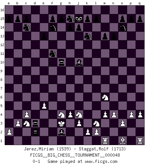 Last move : 0-1 2010 February 13 2:3:41 [Event "FICGS__BIG_CHESS__TOURNAMENT__000048"] [Site "FICGS"] [Date "2009.09.02"] [Round "1"] [White "Jerez,Miriam"] [Black "Staggat,Rolf"] [Result "0-1"] [WhiteElo "1539"] [BlackElo "1713"] 1.j2-l3 h15-g13 2.h1-o7 p16-o14 3.c2-c3 j15-k13 4.f2-f3 d15-d13 5.o2-o3 c16-h11 6.e2-e4 m15-m13 7.m2-m3 n15-n13 8.d2-d3 e15-e13 9.d3-d4 f16-c13 10.n2-n4 o16-g9 11.p1-n2 l16-p12 12.f1-c4 h16-m12 13.o7-m5 m12-c12 14.n2-o4 c12-c4 15.b1-d2 c4-k11 16.m5-d13 b16-c14 17.d13-d5 h11-j10 18.d5-k5 a16-d16 19.k5-k11 j10-k11 20.o4-n6 d16-d10 21.l1-p5 k16-h15 22.d2-c4 k11-c4 23.b2-b3 c4-j10 24.n6-m8 g13-f11 25.h2-j4 c13-e15 26.q2-q4 g9-j11 27.m8-o7 e16-d16 28.p5-j11 e15-j11 29.p2-p4 g16-f14 30.e4-e5 j16-j15 31.c1-h6 d10-c10 32.c3-c4 d16-d4 33.m3-m4 m16-d16 34.g1-e2 d4-d7 35.o7-m6 j11-b4 36.e1-c1 b4-d2 37.h6-d2 d7-d2 38.c1-d1 d2-d1 39.a1-d1 d16-d1 40.j1-h2 d1-d2 41.e2-c3 p12-f3 42.h2-g3 f3-g2 43.k1-h2 c10-g10 44.h2-g4 q16-d16 45.h3-h4 d16-d3 0-1 Follow this game move after move (download)When you absolutely don't know what to do anymore, it is time to panic. (John van der Wiel) Mutter, ich bin eben Ex-Weltmeister geworden. --beim nach Hause Kommen nach dem Verlust des WM-Titels an Mihail Botvinnik -- (Mikhail Nekhemyevich Tal) El Ajedrez es parte de la cultura, y si una cultura esta en decadencia, entonces también el Ajedrez declinará. (Mikhail Botvinnik) Psychologiquement, tu dois avoir confiance en toi même, mais cette confiance doit être basée sur des faits. (Robert Fischer) I don't know, I don't care, and it doesn't make any difference. (Albert Einstein)