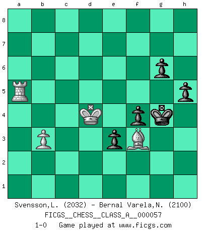 Last move : 1-0 2010 June 24 4:58:58 [Event "FICGS__CHESS__CLASS_A__000057"] [Site "FICGS"] [Date "2009.09.03"] [Round "1"] [White "Svensson,Leif"] [Black "Bernal Varela,Nelson"] [Result "1-0"] [WhiteElo "2032"] [BlackElo "2100"] 1.e4 c5 2.c3 d5 3.exd5 Qxd5 4.d4 Nc6 5.Nf3 Bf5 6.Be3 Nf6 7.Qa4 cxd4 8.cxd4 Bxb1 9.Rxb1 e6 10.Rc1 Bb4+ 11.Kd1 Rb8 12.Bf4 O-O 13.Bxb8 Rxb8 14.Kc2 Qe4+ 15.Bd3 Nxd4+ 16.Nxd4 Qxd4 17.Rhd1 Qxf2+ 18.Kb1 Qb6 19.Qb5 Qxb5 20.Bxb5 g6 21.Be2 Ba5 22.Bf3 Bb6 23.Rc4 e5 24.Rdc1 Kg7 25.Rc8 Rxc8 26.Rxc8 e4 27.Be2 Nd5 28.Rb8 f5 29.Rxb7+ Kf6 30.g3 h5 31.a4 Bg1 32.h4 Bf2 33.a5 Bxg3 34.Rxa7 Bxh4 35.Bc4 Ne3 36.Rf7+ Kg5 37.b3 Ng4 38.a6 Bf2 39.a7 Bxa7 40.Rxa7 f4 41.Kc2 Ne5 42.Ra5 Kf6 43.Kc3 e3 44.Ra6+ Kg5 45.Kd4 Nf3+ 46.Kd3 Kf5 47.Ra5+ Kg4 48.Bd5 Ne5+ 49.Kd4 Nf3+ 50.Bxf3+ 1-0 Sicilian : Alapin's variation (2.c3) Kingside Castling by player Black (move 12) 10 pieces endgame at move 40 : White KRBP , Black KNPPPP WHITE : King + 1 Rook 1 Bishop 1 Pawn BLACK : King + 1 Knight 4 Pawns 9 pieces endgame at move 50 : White KRBP , Black KPPPP WHITE : King + 1 Rook 1 Bishop 1 Pawn BLACK : King + 4 Pawns Player White won this chess game. Follow this game move after move (download)One of these modest little moves may be more embarrassing to your opponent than the biggest threat. (Siegbert Tarrasch) Schach ist mein Leben, meine Leidenschaft, was ich gelernt habe und seit meinem 14. Lebensjahr profimässig praktiziere. Darauf zu verzichten, würde mir sehr schwer fallen. (Viktor Kortschnoi) Cuando tu no sabes absolutamente que mas hacer, es tiempo de entrar en pánico. (John van der Wiel) Je crois qu'il existe des manières très spécifiques de jouer efficacement contre une machine. Evidemment, nous n'avons aucune chance en technique pure, parce que l'ordinateur calcule de manière parfaite. Mais lorsque nous faisons appel à notre cerveau, en utilisant l'intuition et la compréhension, alors nous restons beaucoup plus forts. (Anatoli Karpov) To steal ideas from one person is plagiarism. To steal from many is research. (Unknown)
