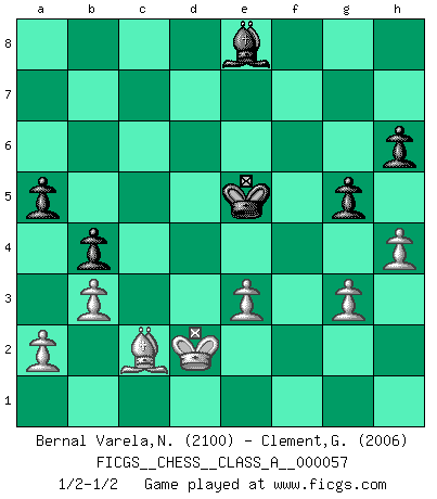 Last move : 1/2-1/2 2009 December 17 16:8:9 [Event "FICGS__CHESS__CLASS_A__000057"] [Site "FICGS"] [Date "2009.09.03"] [Round "1"] [White "Bernal Varela,Nelson"] [Black "Clement,George"] [Result "1/2-1/2"] [WhiteElo "2100"] [BlackElo "2006"] 1.e4 e5 2.Nf3 Nc6 3.Bb5 a6 4.Ba4 Nf6 5.O-O Nxe4 6.d4 b5 7.Bb3 d5 8.Nxe5 Nxe5 9.dxe5 Be6 10.Be3 Bc5 11.Bxc5 Nxc5 12.Qd4 Nb7 13.c3 O-O 14.Bc2 c5 15.Qd3 g6 16.Qg3 d4 17.Rd1 Rc8 18.h3 Na5 19.Be4 f6 20.exf6 Qxf6 21.cxd4 cxd4 22.Nd2 Nc4 23.b3 Nb2 24.Rdb1 d3 25.Rc1 Bf7 26.Qe3 Rfe8 27.Rxc8 Rxc8 28.Re1 Rc2 29.Nf3 Kg7 30.h4 h6 31.g3 b4 32.Nd4 Rc7 33.Rb1 Rd7 34.Rxb2 Qxd4 35.Rd2 Qxe3 36.fxe3 a5 37.Rxd3 Rxd3 38.Bxd3 Kf6 39.Kf2 Ke5 40.Bc2 g5 41.Ke2 Kd6 42.Bd3 Bh5+ 43.Ke1 Ke5 44.Kd2 Be8 45.Bc2 1/2-1/2 Ruy Lopez : Open, 7.Bb3 Kingside Castling by player White (move 5) Kingside Castling by player Black (move 13) This chess game ended in a draw. Follow this game move after move (download)Even the laziest King flees wildly in the face of a double check ! (Aaron Nimzowitsch) Was ist der Unterschied zwischen einem Strassenarbeiter und einem Schachspieler? --Der Schachspieler bewegt sich ab und zu. (Anonymous) Botvinnik trató de alejar el misterio referente al Ajedrez, siempre relacionandolo a situaciones de la vida diaria. Solía llamar al Ajedrez un problema inexacto típico, similar a aquellos en que la gente tiene siempre que resolver a cada día. (Garry Kasparov) Je ne suis pas le dernier à jouer lâchement des coups douteux pendant le zeïtnot de l'adversaire pour l'achever: en effet les coups qui font le plus peur sont ceux que l'on ne comprend pas. Je me fais souvent peur quand je joue. (Un professeur anonyme) It is not enough to be a good player... you must also play well. (Siegbert Tarrasch)