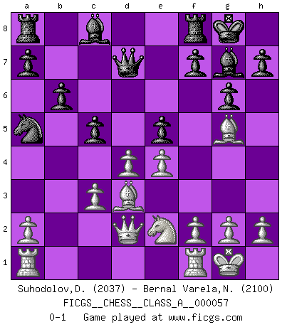 Last move : 0-1 2009 November 16 21:0:51 [Event "FICGS__CHESS__CLASS_A__000057"] [Site "FICGS"] [Date "2009.09.03"] [Round "1"] [White "Suhodolov,Dmitry"] [Black "Bernal Varela,Nelson"] [Result "0-1"] [WhiteElo "2037"] [BlackElo "2100"] 1.d4 Nf6 2.c4 g6 3.Nc3 d5 4.cxd5 Nxd5 5.e4 Nxc3 6.bxc3 Bg7 7.Bc4 c5 8.Ne2 O-O 9.O-O Nc6 10.Be3 Na5 11.Bd3 b6 12.Qd2 e5 13.Bg5 Qd7 0-1 King's Indian defense, 3.Nc3 Kingside Castling by player Black (move 8) Kingside Castling by player White (move 9) Player Black won this chess game. Follow this game move after move (download)White lost because he failed to remember the right continuation and had to think up the moves himself. (Siegbert Tarrasch) Kein Schachspieler kann gut schlafen. (H. G. Wells) La esencia del Ajedrez es pensar acerca de lo que el Ajedrez es. (David Bronstein) Aux échecs, l'amour-propre est satisfait quand on remporte la victoire, mais il n'y a pas de honte à être battu. (Benjamin Franklin) A married woman is like a fish riding a bicycle. (Rodolfo d'Ettorre)
