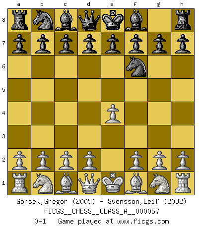 Last move : 0-1 2009 October 13 21:3:30 [Event "FICGS__CHESS__CLASS_A__000057"] [Site "FICGS"] [Date "2009.09.03"] [Round "1"] [White "Gorsek,Gregor"] [Black "Svensson,Leif"] [Result "0-1"] [WhiteElo "2009"] [BlackElo "2032"] 1.e4 Nf6 0-1 This chess game has been lost on time (started : 2009.09.03 11:34:51) Alekhine's defense Player Black won this chess game. Follow this game move after move (download)Chess mastery essentially consists of analyzing Chess positions accurately. (Mikhail Botvinnik) Wenn Spassky eine Figur opfert kannst du genauso gut aufgeben. Aber wenn Tal eine Figur opfert, spiel weiter. Er könnte noch eine weitere opfern, und dann ... wer weiß? (Miguel Najdorf) Aquel que toma al Peón de Caballo de la Reina, se pasará la noche a dormir en la calle. (Anónimo) Tous ces prétendus hommes politiques sont les pions, les Cavaliers, les Tours ou les Fous d'une partie d'échecs qui se jouera tant qu'un hasard ne renversera pas l'échiquier. (Honoré de Balzac) It is not titles that honor men, but men that honor titles. (Niccolo Machiavelli)