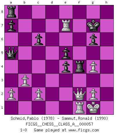 Last move : 1-0 2010 March 26 21:33:12 [Event "FICGS__CHESS__CLASS_A__000057"] [Site "FICGS"] [Date "2009.09.03"] [Round "1"] [White "Schmid,Pablo"] [Black "Sammut,Ronald"] [Result "1-0"] [WhiteElo "1978"] [BlackElo "1990"] 1.e4 c5 2.Nf3 d6 3.Nc3 Nc6 4.d4 cxd4 5.Nxd4 Nf6 6.Bc4 Qb6 7.Nxc6 bxc6 8.O-O g6 9.e5 dxe5 10.Qe2 Qd4 11.Be3 Qd6 12.Rad1 Qc7 13.f4 Bg4 14.Qf2 e4 15.Rd2 Bf5 16.h3 h5 17.Bd4 Bg7 18.Nd1 O-O 19.Ne3 Be6 20.Bxe6 fxe6 21.Be5 Qa5 22.b3 Ng4 23.Nxg4 hxg4 24.Bxg7 Kxg7 25.hxg4 e5 26.Rd7 Rxf4 27.Rxe7+ 1-0 Sicilian Kingside Castling by player White (move 8) Kingside Castling by player Black (move 18) Player White won this chess game. Follow this game move after move (download)The tactician knows what to do when there is something to do; whereas the strategian knows what to do when there is nothing to do. (Gerald Abrahams) Wenn ich gewinne bin ich ein Genie. Wenn nicht, dann bin ich keines. (Robert James Fischer) Todo lo que importa ante el tablero de Ajedrez son buenas jugadas. (Bobby Fischer) Le thème de l'attaque double intervient d'une manière ou d'une autre dans l'immense majorité des combinaisons. (Youri Averbakh) Imagination is more important than knowledge. Knowledge is limited. Imagination encircles the world. (Albert Einstein)