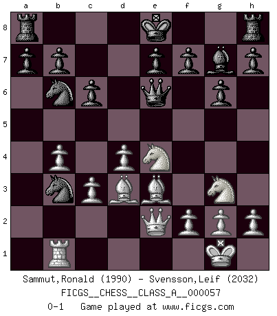 Last move : 0-1 2010 April 21 9:18:4 [Event "FICGS__CHESS__CLASS_A__000057"] [Site "FICGS"] [Date "2009.09.03"] [Round "1"] [White "Sammut,Ronald"] [Black "Svensson,Leif"] [Result "0-1"] [WhiteElo "1990"] [BlackElo "2032"] 1.e4 Nf6 2.e5 Nd5 3.d4 d6 4.Nf3 dxe5 5.Nxe5 c6 6.Be2 Bf5 7.O-O Nd7 8.Nf3 Nb4 9.c3 Nc2 10.Nh4 Nxa1 11.Nxf5 Qa5 12.Bd3 Qxa2 13.Nd2 Nb6 14.Bb1 Qa5 15.Ne4 g6 16.b4 Qa6 17.Nfg3 Qc4 18.Bd3 Qb3 19.Qe2 Qe6 20.Be3 Nb3 21.Rb1 Bg7 0-1 This chess game has been lost on time (started : 2009.09.03 11:34:51) Alekhine's defense : Modern, Larsen variation Kingside Castling by player White (move 7) Player Black won this chess game. Follow this game move after move (download)A chess genius has died; a loss for humanity. (Viktor Kortchnoi, about Bobby Fischer's death) Mein Gehirn das ist mein zweitwichtigstes Organ [Aus dem Film: Der Schläfer]. (Woody Allen) Si tu oponente no puede hacer nada activo, entonces no apures la posición; En vez de eso, dejalo estar sentado ahí, sufriendo y rogandote por un empate. (Jeremy Silman) Karpov est une pièce de musée. (Garry Kasparov) Shallow men believe in luck. Strong men belive in cause and effect. (Ralph Waldo Emerson)