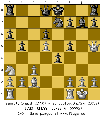 Last move : 1-0 2009 November 26 8:48:10 [Event "FICGS__CHESS__CLASS_A__000057"] [Site "FICGS"] [Date "2009.09.03"] [Round "1"] [White "Sammut,Ronald"] [Black "Suhodolov,Dmitry"] [Result "1-0"] [WhiteElo "1990"] [BlackElo "2037"] 1.e4 c5 2.Nf3 Nc6 3.d4 cxd4 4.Nxd4 Nf6 5.Nc3 e5 6.Ndb5 d6 7.Bg5 a6 8.Na3 b5 9.Bxf6 gxf6 10.Nd5 f5 11.Bd3 Be6 12.O-O Bxd5 13.exd5 Ne7 14.c3 Bg7 15.Qh5 e4 16.Bc2 1-0 Sicilian : Pelikan (Lasker/Sveshnikov) variation Kingside Castling by player White (move 12) Player White won this chess game. Follow this game move after move (download)Don't even mention losing to me. I can't stand to think of it. (Bobby Fischer) Smyslow ist ein Beweis dafür, dass ich noch zehn Jahre spielen kann! [der 75 jährige über den 85 jährigen] (Viktor Kortschnoi) Los asuntos humanos son como una partida de Ajedrez: solo aquellos que no lo toman seriamente, pueden ser llamados buenos jugadores. (Hung Tzu Ch'eng) Ce qui caractérise les parties de combat, c'est que si le défenseur a constamment de difficiles problèmes à résoudre, l'attaquant doit chercher sans relâche de nouvelles possibilités d'attaque. (Koblentz) Gambling : The sure way of getting nothing from something. (Wilson Mizner)
