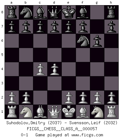 Last move : 0-1 2009 November 12 20:46:41 [Event "FICGS__CHESS__CLASS_A__000057"] [Site "FICGS"] [Date "2009.09.03"] [Round "1"] [White "Suhodolov,Dmitry"] [Black "Svensson,Leif"] [Result "0-1"] [WhiteElo "2037"] [BlackElo "2032"] 1.d4 Nf6 2.c4 g6 0-1 This chess game has been lost on time (started : 2009.09.03 11:34:51) King's Indian defense Player Black won this chess game. Follow this game move after move (download)I have always a slight feeling of pity for the man who has no knowledge of Chess. (Siegbert Tarrasch) Das ganze Leben mit einer Ehefrau ist wie ein Endspiel mit ungleichfarbigen Läufern. (Viktor Kortschnoi) La belleza de un movimiento no se refleja solo en su apariencia, sino en el pensamiento detrás de él. (Siegbert Tarrasch) Je ne crois pas en la psychologie, je crois aux bons coups. (Robert Fischer) Locking firmely the window serves nothing, only small thiefs pass through there, the big thiefs enter through the front door. (Luc-Olivier Leclerc)