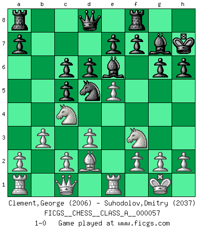 Last move : 1-0 2009 November 21 20:37:42 [Event "FICGS__CHESS__CLASS_A__000057"] [Site "FICGS"] [Date "2009.09.03"] [Round "1"] [White "Clement,George"] [Black "Suhodolov,Dmitry"] [Result "1-0"] [WhiteElo "2006"] [BlackElo "2037"] 1.e4 c5 2.Nf3 Nc6 3.Bb5 g6 4.O-O Bg7 5.d3 Nf6 6.Bxc6 bxc6 7.e5 Nd5 8.Nbd2 O-O 9.Nc4 d6 10.Re1 h6 11.Bd2 Be6 12.Qc1 Kh7 13.b3 1-0 Sicilian : Nimzovich-Rossolimo attack (with ...g6, without ...d6) Kingside Castling by player White (move 4) Kingside Castling by player Black (move 8) Player White won this chess game. Follow this game move after move (download)Is Bobby Fischer quite sane ? (Salo Flohr) Die Arbeit ist etwas Unnatürliches. Die Faulheit allein ist göttlich. (Anatole France) Los Peones son nacidos libres, y aún así, se encuentran por doquier encadenados. (Rick Kennedy) Si rien de grave n'est détecté lors de l'analyse d'une position, on joue alors le coup. Seconde règle de Blumenfeld. However beautiful the strategy, you should occasionally look at the results. (Winston Churchill)