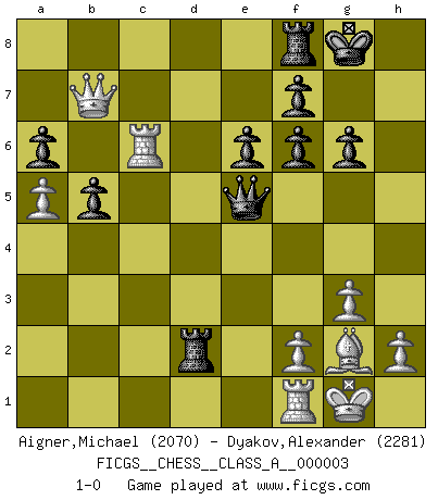 Last move : 1-0 2006 October 23 7:28:41 [Event "FICGS__CHESS__CLASS_A__000003"] [Site "FICGS"] [Date "2006.04.22"] [Round "1"] [White "Aigner,Michael"] [Black "Dyakov,Alexander"] [Result "1-0"] [WhiteElo "2070"] [BlackElo "2281"] 1.d4 d5 2.g3 Nf6 3.Nf3 c6 4.Bg2 Bf5 5.O-O e6 6.Nh4 Bg6 7.Nxg6 hxg6 8.a4 Bd6 9.c4 Nbd7 10.a5 b5 11.cxb5 cxb5 12.Nc3 Rb8 13.Qd3 a6 14.e4 dxe4 15.Nxe4 Nxe4 16.Qxe4 Qc7 17.Bg5 Nf6 18.Bxf6 gxf6 19.Rfc1 Qa7 20.Rc6 Be7 21.Rac1 Rd8 22.Rc7 Qxd4 23.Qb7 O-O 24.Rxe7 Qxb2 25.Rec7 Rd2 26.Rf1 Qe5 27.Rc6 1-0 This chess game has been lost on time (started : 2006.04.22 19:40:33) Queen's pawn game Kingside Castling by player White (move 5) Kingside Castling by player Black (move 23) Player White won this chess game. Follow this game move after move (download)All Chess players should have a hobby. (Savielly Tartakower) Wenn Du einsam bist, wenn Du Dich in der Welt wie ein Fremder fühlst, spiele Schach. Das wird Deinen Geist erheben und Dein Ratgeber im Kampf sein. (Aristoteles) ¿Porque tengo que perder ante este idiota?. (Aron Nimzovich) On peut tirer plus d'utilité d'une partie perdue que de 100 parties gagnées. (Capablanca) Mandala - that's it! 16x16 squares as multiple of the four and the eight because of the Four Noble Truths and the Noble Eightfold Path. (Heinz-Georg Lehnhoff about Big Chess)