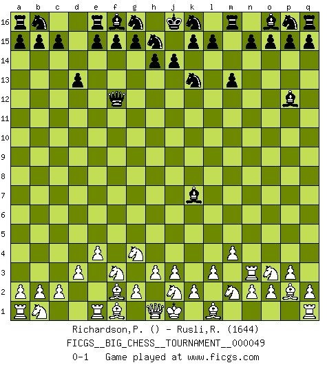 Last move : 0-1 2009 December 4 20:57:20 [Event "FICGS__BIG_CHESS__TOURNAMENT__000049"] [Site "FICGS"] [Date "2009.09.06"] [Round "1"] [White "Richardson,Patrick"] [Black "Rusli,Rafnizar"] [Result "0-1"] [WhiteElo ""] [BlackElo "1644"] 1.d2-d3 j15-k13 2.m2-m4 h16-o10 3.p1-o3 o10-f2 4.g1-f3 d15-d13 5.h2-g4 f2-l7 6.l2-l3 c16-j10 7.p2-p3 j10-d5 8.e2-e4 d5-f7 9.m1-m3 f7-k3 10.m3-n3 m15-m13 11.o1-p2 l16-p12 12.k1-m2 k3-m5 13.c1-e3 m5-k7 14.e3-f2 l7-f12 0-1 Follow this game move after move (download)A Chess game is a dialogue, a conversation between a player and his opponent. Each move by the opponent may contain threats or be a blunder, but a player cannot defend against threats or take advantage of blunders if he does not first ask himself: What is my opponent planning after each move ? (Bruce A. Moon) Karpov ist ein Museumsstück. (Garry Kasparov) ¡Examina movidas que hagan daño! Un buen ojo for movidas desvastantes es mucho mas importante que el conocimiento de principios estratégicos. (Purdy) Les échecs sont un jeu terrible. Si vous n'avez pas le centre, votre adversaire a une position plus libre. Par contre, si vous avez le centre, alors vous avez vraiment quelque chose pour laquelle vous inquiéter ! (Siegbert Tarrasch) Tree pose grows confidence. It roots me to this world. (Terri Guillemets)
