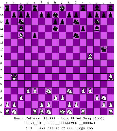 Last move : 1-0 2009 December 7 9:25:10 [Event "FICGS__BIG_CHESS__TOURNAMENT__000049"] [Site "FICGS"] [Date "2009.09.06"] [Round "1"] [White "Rusli,Rafnizar"] [Black "Ould Ahmed,Samy"] [Result "1-0"] [WhiteElo "1644"] [BlackElo "1651"] 1.j2-k4 j15-h13 2.h1-o7 p16-o14 3.o7-c7 h15-j13 4.m2-m4 b16-c14 5.h2-g4 h16-o10 6.e2-e4 m15-m13 7.d2-d4 l16-o13 8.n2-n4 e15-e13 9.c2-c3 f16-b12 10.o2-o3 g16-f14 11.l1-q6 k16-l14 12.o1-b13 e13-e12 13.c7-b6 b12-c13 14.c1-m10 f14-h15 15.p1-n2 a15-a14 16.b13-c12 j13-l12 17.m10-n9 o10-p10 18.n2-p3 1-0 This big chess game has been lost on time (started : 2009.09.06 6:22:19) Follow this game move after move (download)For me, Chess is life and every game is like a new life. Every Chess player gets to live many lives in one lifetime. (Eduard Gufeld) Ich verstehe Aljechins Kombinationen ganz gut; aber woher er diese Angriffschancen bekommt und wie er die Eröffnung behandelt das ist für mich ein Buch mit sieben Siegeln. (Rudolf Spielmann) El jugador blanco perdió porque fallo en recordar la coreccta continuación y tuvo que pensar por sí mismo las movidas. (Siegbert Tarrasch) Il n'y a pas eu de défaite parce que je ne crois pas que cet ordinateur ait jamais existé. IBM a triché en refusant d'imprimer les modes de recherche de la machine. C'est évident, pendant le match, des coups décisifs ont été joués par des êtres humains. Aujourd'hui, les meilleurs spécialistes en informatique ne peuvent toujours pas expliquer comment Deep-Blue a pu jouer contre la logique des ordinateurs. IBM a gagné une guerre de communication, mais ils sont incapables de prouver que l'ordinateur a gagné tout seul. (Garry Kasparov) The greatest con, that he ever pulled... was making you believe... that he is you. (Revolver, movie)