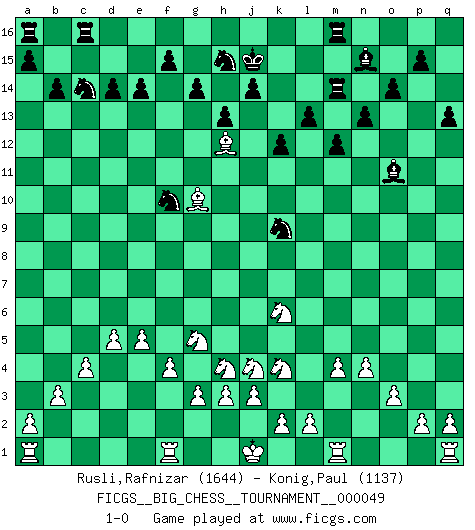 Last move : 1-0 2010 January 29 1:17:53 [Event "FICGS__BIG_CHESS__TOURNAMENT__000049"] [Site "FICGS"] [Date "2009.09.06"] [Round "1"] [White "Rusli,Rafnizar"] [Black "Konig,Paul"] [Result "1-0"] [WhiteElo "1644"] [BlackElo "1137"] 1.j2-k4 p16-o14 2.h1-o7 g15-g14 3.o7-c7 k15-k14 4.c7-c15 b16-c14 5.c15-l7 l15-l13 6.m2-m4 h16-e13 7.l7-k7 k16-l14 8.d2-d4 n15-n13 9.c1-k8 e13-b10 10.b2-b3 d15-d14 11.n2-n4 c16-p4 12.o2-o3 p4-j10 13.k7-n10 b10-f10 14.g1-f3 f10-j13 15.e2-e4 m15-m13 16.p1-q3 l16-p12 17.n10-p10 j10-l8 18.o1-f9 h14-h13 19.f1-b5 l14-m12 20.l1-o4 j13-b6 21.b1-d2 g16-f14 22.c2-c4 b6-k6 23.g2-g3 q15-q13 24.k8-p13 o16-n15 25.h2-j4 k6-k11 26.k1-l3 k11-o11 27.p10-o11 p12-o11 28.f3-h4 m12-l14 29.f9-l14 j15-l14 30.b5-l14 j16-j15 31.l14-g10 k14-k13 32.o4-j9 m13-m12 33.j9-h10 k13-k12 34.d4-d5 f16-j13 35.j4-k6 l8-n10 36.e4-e5 o14-m13 37.p13-j7 j13-b6 38.e1-f1 f14-g12 39.h10-g9 m13-l11 40.f2-f4 m16-m14 41.q3-p5 q16-m16 42.p5-o7 e16-c16 43.o7-p9 o15-o14 44.p9-o11 n10-o11 45.d2-f3 b15-b14 46.f3-g5 l11-k9 47.j7-l9 e15-e14 48.l3-j4 b6-f10 49.g9-f10 g12-f10 50.l9-h12 1-0 Follow this game move after move (download)Fischer Chess play was always razor-sharp, rational and brilliant. One of the best ever. (Dave Regis) Es gibt keine einzige Frau, der ich nicht einen Springer vorgeben könnte und trotzdem gewänne. (Robert James Fischer) Nos gusta pensar. (Gary Kasparov) J'apprécie les joueurs d'est-indienne, c'est grâce à eux que je nourris ma famille depuis tant d'années. (Petrosian) Always be a first-rate version of yourself, instead of a second-rate version of somebody else. (Judy Garland)