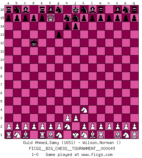 Last move : 1-0 2009 October 8 8:50:5 [Event "FICGS__BIG_CHESS__TOURNAMENT__000049"] [Site "FICGS"] [Date "2009.09.06"] [Round "1"] [White "Ould Ahmed,Samy"] [Black "Wilson,Norman"] [Result "1-0"] [WhiteElo "1651"] [BlackElo ""] 1.j2-k4 g15-g13 2.h1-o7 h16-d12 3.o7-f15 1-0 Follow this game move after move (download)When you absolutely don't know what to do anymore, it is time to panic. (John van der Wiel) Versuche, dich von der Sklaverei der Eröffnungsvarianten zu befreien. Stattdessen soll man gewisse Typenpositionen erlernen, die man eingehend analysiert. (Aaron Nimzowitsch) Sin errores no puede haber brillantez. (Emanuel Lasker) Il n'y a plus de joueurs du niveau de Jacob Murray dont la seule quête est le beau jeu, le plaisir de voir les pièces construire quelque chose. Sur 10 idées à la minute, 9 seront sans intérêt, la dernière s'avèrera géniale. (Christian Bauer) He who defends everything defends nothing. (Frederick the Great)