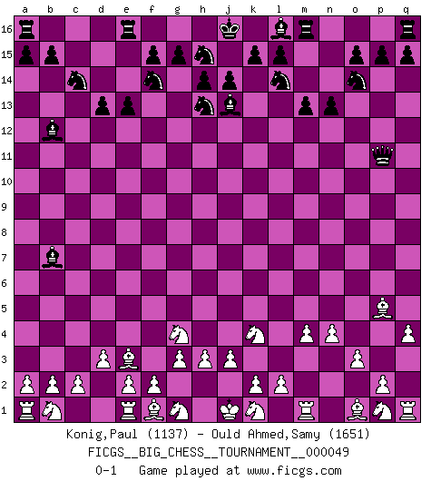 Last move : 0-1 2009 December 3 20:52:45 [Event "FICGS__BIG_CHESS__TOURNAMENT__000049"] [Site "FICGS"] [Date "2009.09.06"] [Round "1"] [White "Konig,Paul"] [Black "Ould Ahmed,Samy"] [Result "0-1"] [WhiteElo "1137"] [BlackElo "1651"] 1.j2-k4 j15-h13 2.h1-o7 p16-o14 3.o7-l7 k16-l14 4.l7-c15 b16-c14 5.c15-m6 m15-m13 6.h2-g4 h16-o10 7.o2-o3 e15-e13 8.m2-m4 n15-n13 9.l1-p5 o16-h10 10.m6-f6 g16-f14 11.d2-d3 o10-p11 12.q2-q4 f16-a11 13.f6-h6 h10-k12 14.c1-e3 a11-b12 15.h6-b6 k12-j13 16.b6-b7 d15-d13 17.g2-g3 c16-g12 18.n2-n4 g12-b7 0-1 Follow this game move after move (download)Chess is so inspiring that I do not believe a good player is capable of having an evil thought during the game. (Wilhelm Steinitz) Kombinieren und Schwarzhandel gehören verboten. (Savielly Grigorievitsch Tartakower) ¡Examina movidas que hagan daño! Un buen ojo for movidas desvastantes es mucho mas importante que el conocimiento de principios estratégicos. (Purdy) Si rien de grave n'est détecté lors de l'analyse d'une position, on joue alors le coup. Seconde règle de Blumenfeld. Convictions are more dangerous enemies of truth than lies. (Friedrich Nietzsche)