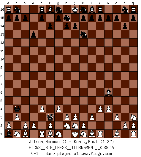 Last move : 0-1 2009 October 6 8:42:43 [Event "FICGS__BIG_CHESS__TOURNAMENT__000049"] [Site "FICGS"] [Date "2009.09.06"] [Round "1"] [White "Wilson,Norman"] [Black "Konig,Paul"] [Result "0-1"] [WhiteElo ""] [BlackElo "1137"] 1.e2-e4 j15-k13 2.o2-o3 h16-l13 3.l2-l3 d15-d13 4.g2-g4 c16-n6 5.m2-m4 p15-p14 6.h1-f3 f15-f14 7.n2-n4 o16-p15 8.p1-q3 l13-b4 9.b2-b3 p15-a1 0-1 Follow this game move after move (download)Fischer, who may or may not be mad as a hatter, has every right to be horrified. (Jeremy Silman) Wer sich die Fähigkeit anerziehen will im Schach selbstständig zu denken, der muß alles meiden, was leblos ist: ausgeklügelte Theorien, die sich auf sehr wenige Beispiele und eine Menge Hirngespinste stützen. (Emanuel Lasker) No existe un remordimiento como el remordimiento del Ajedrez. (H. G. Wells) La menace est plus forte que l'exécution. (Aaron Nimzovitch) If I had no sense of humor, I would long ago have committed suicide. (Mahatma Gandhi)
