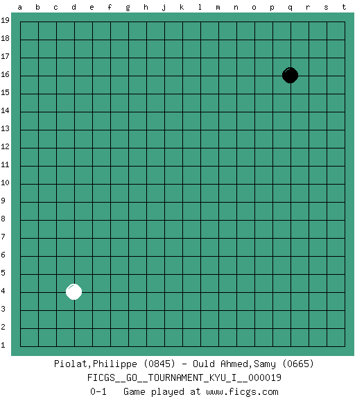 Last move : 0-1 2009 October 21 21:45:39 [Event "FICGS__GO__TOURNAMENT_KYU_I__000019"] [Site "FICGS"] [Date "2009.09.08"] [Round "1"] [Black "Piolat,Philippe"] [White "Ould Ahmed,Samy"] [Result "0-1"] [Rating 1 "0845"] [Rating 2 "0665"] 1.q16 d4 0-1 This go game has been lost on time (started : 2009.09.08 11:11:29) Here are the names of the openings (joseki) played in the four corners : Corner d4 : d4 0-1 Hoshi (Hwajeom, Seongjeom, Xingwei`) 4-4 Point. The star or hoshi (4-4) point, emphasizing influence at the potential expense of territory. Player White won this Go (weiqi, baduk) game. Follow this game move after move (download)The L-group is dead. (Anonymous) Logic : The art of thinking and reasoning in strict accordance with the limitations and incapacities of the human misunderstanding. (Ambrose Bierce)