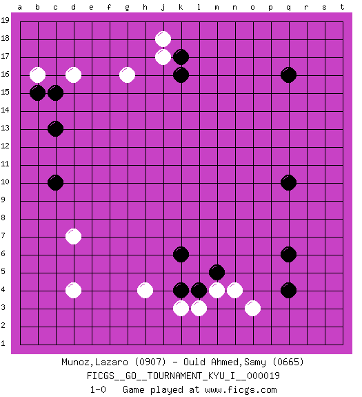Last move : 1-0 2009 October 24 8:22:47 [Event "FICGS__GO__TOURNAMENT_KYU_I__000019"] [Site "FICGS"] [Date "2009.09.08"] [Round "1"] [Black "Munoz,Lazaro"] [White "Ould Ahmed,Samy"] [Result "1-0"] [Rating 1 "0907"] [Rating 2 "0665"] 1.q16 d4 2.q4 d16 3.q10 o3 4.q6 m4 5.k4 h4 6.k6 k3 7.l4 l3 8.m5 n4 9.c10 d7 10.c13 g16 11.k16 j17 12.k17 j18 13.b15 b16 14.c15 1-0 This go game has been lost on time (started : 2009.09.08 11:11:29) Here are the names of the openings (joseki) played in the four corners : Corner q4 : q4 o3 Hoshi (Hwajeom, Seongjeom, Xingwei`) 4-4 Point. The star or hoshi (4-4) point, emphasizing influence at the potential expense of territory. Ikken Kakari (Hankan Keolch'im, Yi Gua`jiao~, 1-Space Low Approach). White 2 is the standard approach move to the 4-4. Corner d16 : d16 c13 Hoshi (Hwajeom, Seongjeom, Xingwei`) 4-4 Point. The star or hoshi (4-4) point, emphasizing influence at the potential expense of territory. Nikken Kakari (Dukan Keolch'im, E`r Gua`jiao~, 2-Space Low Approach). White typically answers by 7-3 or 3-5 (which is not joseki). Player Black won this Go (weiqi, baduk) game. Follow this game move after move (download)Capture what you cut off. (Anonymous) The beginning of wisdom is silence. The second step is listening. (Unknown)