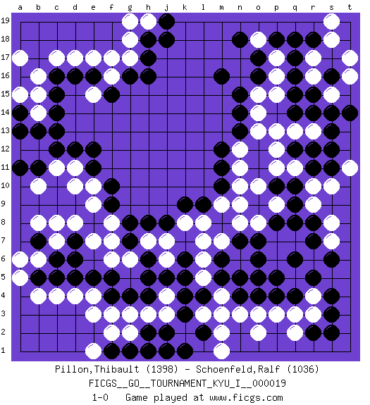 Last move : 1-0 2009 October 4 21:16:53 [Event "FICGS__GO__TOURNAMENT_KYU_I__000019"] [Site "FICGS"] [Date "2009.09.08"] [Round "1"] [Black "Pillon,Thibault"] [White "Schoenfeld,Ralf"] [Result "1-0"] [Rating 1 "1398"] [Rating 2 "1036"] 1.q16 d4 2.c16 r4 3.p4 p3 4.q4 q3 5.r5 r3 6.o4 o3 7.n4 n3 8.q10 m4 9.m5 l5 10.m6 l6 11.c6 d8 12.f4 e3 13.d5 c4 14.e5 f3 15.e8 d10 16.g4 g3 17.d7 c8 18.h4 h3 19.d12 c11 20.c12 e17 21.h16 g17 22.h17 c17 23.d16 d17 24.g16 f17 25.l9 b14 26.m16 q13 27.r14 r13 28.q14 r10 29.r11 r9 30.r8 q11 31.q12 p11 32.r12 p12 33.s13 p13 34.q9 s10 35.s11 t11 36.s12 s8 37.r7 s7 38.s6 r17 39.q17 r16 40.r18 s15 41.s14 s18 42.q18 s19 43.e11 e10 44.f10 e9 45.f9 d11 46.e12 b12 47.l4 m3 48.k4 j4 49.j5 j3 50.k5 l7 51.r15 t16 52.h18 g18 53.c14 b16 54.b13 a13 55.c13 b15 56.c15 m7 57.n7 n8 58.o7 m9 59.m10 n10 60.o9 o8 61.p8 o10 62.m11 n11 63.m12 n12 64.n13 l8 65.k9 k8 66.j8 j7 67.h8 h7 68.h6 f8 69.g8 e7 70.g7 j6 71.k6 p9 72.p10 p7 73.o6 o13 74.n14 o14 75.n15 o15 76.o16 p15 77.q15 p16 78.o17 p17 79.p18 o18 80.n18 f6 81.b5 b4 82.b7 b8 83.s4 p6 84.o5 n6 85.n5 q5 86.q6 q7 87.p5 n9 88.t14 t17 89.s16 p9 90.q8 g6 91.h5 a6 92.s3 c7 93.d6 b6 94.c5 a5 95.r2 q2 96.s2 e15 97.e16 f16 98.f15 h19 99.j19 g19 100.j18 e4 101.f5 f7 102.l2 l3 103.k3 k2 104.j2 m2 105.k1 o2 106.f1 g2 107.g1 h1 108.h2 e1 109.j1 f2 110.h1 m1 111.b11 a12 112.a14 a15 113.a11 a17 114.a14 b10 115.a13 1-0 Here are the names of the openings (joseki) played in the four corners : Corner q4 : r4 p4 Komoku (Somok, Xiao~mu`) 3-4 Point. The komoku (3-4) point is the traditional corner enclosure move.. Ikken Takagakari (Hankan Nop'dakeolch'im, Yi Gaogua`jiao~, 1-Space High Approach). The 5-4 approach move has become more popular in modern times, as modern Go emphasizes speed and influence. Corner d4 : d4 c6 Hoshi (Hwajeom, Seongjeom, Xingwei`) 4-4 Point. The star or hoshi (4-4) point, emphasizing influence at the potential expense of territory. Ikken Kakari (Hankan Keolch'im, Yi Gua`jiao~, 1-Space Low Approach). Black 2 is the standard approach move to the 4-4. Player Black won this Go (weiqi, baduk) game. Follow this game move after move (download)Conservative and slow will win. Believe it ! (Anonymous) The right perception of any matter and a misunderstanding of the same matter do not wholly exclude each other. (Kafka's the trial)