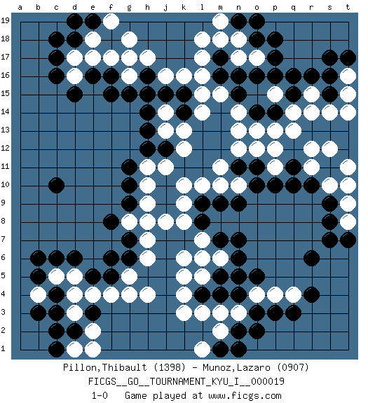 Last move : 1-0 2009 October 16 11:2:5 [Event "FICGS__GO__TOURNAMENT_KYU_I__000019"] [Site "FICGS"] [Date "2009.09.08"] [Round "1"] [Black "Pillon,Thibault"] [White "Munoz,Lazaro"] [Result "1-0"] [Rating 1 "1398"] [Rating 2 "0907"] 1.p17 d4 2.d15 q4 3.c6 c5 4.d6 f4 5.c10 e17 6.c17 h17 7.r6 k3 8.q10 l17 9.o3 o4 10.p3 p4 11.q3 n3 12.r4 r14 13.r16 r12 14.s11 s12 15.f15 l15 16.p14 p12 17.o10 n12 18.n4 n5 19.m4 m3 20.o5 n17 21.l4 l3 22.n6 m10 23.m9 l10 24.l9 k10 25.g10 k9 26.g17 g18 27.f18 f17 28.e3 e4 29.c3 d3 30.b5 g16 31.g6 h4 32.o18 n18 33.s15 s14 34.d18 e18 35.g15 k5 36.l6 k6 37.d2 e2 38.c2 b4 39.c4 d5 40.b6 l5 41.m5 l7 42.n9 m6 43.n7 g8 44.h8 h9 45.g9 h7 46.f8 j8 47.f5 g4 48.h12 k12 49.j15 j16 50.k15 k16 51.n15 h15 52.h14 j14 53.h16 k4 54.n5 h15 55.k14 j13 56.h13 l14 57.h16 r11 58.r10 s10 59.s9 t11 60.h15 n14 61.o14 n13 62.n2 m2 63.o2 t9 64.s8 r15 65.s16 d16 66.c16 d17 67.c18 n10 68.o11 o12 69.g7 h8 70.n19 m19 71.o19 l18 72.o16 o17 73.p18 h10 74.j12 k13 75.q15 q13 76.m16 m15 77.n16 l16 78.m17 m18 79.e5 h11 80.g11 j11 81.m7 l6 82.l8 h6 83.f16 g17 84.n11 m11 85.q11 g5 86.f6 p11 87.p10 q14 88.m1 l1 89.n1 t15 90.q16 t16 91.t17 t14 92.s17 t8 93.t7 t10 94.s7 d1 95.b3 k8 96.c1 e1 97.e19 f19 98.d19 p13 99.e16 o13 100.pass p15 101.p16 1-0 Here are the names of the openings (joseki) played in the four corners : Corner d4 : d4 c6 Hoshi (Hwajeom, Seongjeom, Xingwei`) 4-4 Point. The star or hoshi (4-4) point, emphasizing influence at the potential expense of territory. Ikken Kakari (Hankan Keolch'im, Yi Gua`jiao~, 1-Space Low Approach). Black 2 is the standard approach move to the 4-4. Corner d16 : d15 e17 Takamoku (Gomok, Gaomu`) 5-4 Point. The takamoku (high) point (5-4). With its emphasis on influence, the 5-4 point complements the 4-4 (hoshi) point in creating an influence-oriented fuseki. Corner q4 : q4 r6 Hoshi (Hwajeom, Seongjeom, Xingwei`) 4-4 Point. The star or hoshi (4-4) point, emphasizing influence at the potential expense of territory. Ikken Kakari (Hankan Keolch'im, Yi Gua`jiao~, 1-Space Low Approach). Black 2 is the standard approach move to the 4-4. Corner q16 : p17 l17 Mokuhazushi (Waemok, Wai`mu`) 5-3 Point. The mokuhazushi (5-3) point was popular in the Edo period in Japan (1600 - 1867). It emphasizes influence; territorially, it is inferior to the 3-4 point. Player Black won this Go (weiqi, baduk) game. Follow this game move after move (download)Keshi is worth as much as an invasion ! (Anonymous) He who fights with monsters should be careful lest he thereby become a monster. (Friedrich Nietzsche, Beyond Good and Evil)