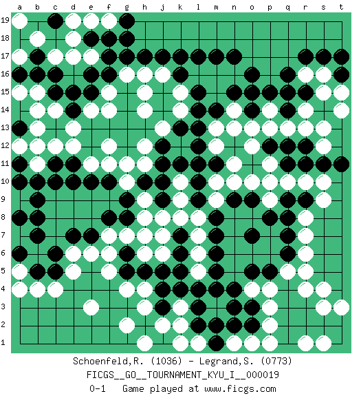 Last move : 0-1 2009 September 28 22:47:3 [Event "FICGS__GO__TOURNAMENT_KYU_I__000019"] [Site "FICGS"] [Date "2009.09.08"] [Round "1"] [Black "Schoenfeld,Ralf"] [White "Legrand,Stephane"] [Result "0-1"] [Rating 1 "1036"] [Rating 2 "0773"] 1.q16 c4 2.q3 d17 3.q9 e3 4.d10 c14 5.c6 e6 6.d7 b10 7.c10 b11 8.b9 d12 9.k16 r14 10.q12 p14 11.o16 s16 12.r17 s12 13.r12 s13 14.s11 s10 15.t11 r10 16.r11 q10 17.p10 r8 18.r9 s9 19.q11 p9 20.q8 r7 21.q7 r6 22.o9 o10 23.p8 l8 24.o11 n14 25.f17 e17 26.f16 f12 27.k4 h3 28.j3 h4 29.m7 l7 30.m8 l6 31.m6 l5 32.m4 r4 33.r3 p4 34.q4 q5 35.p5 o4 36.q6 r5 37.m5 p2 38.o3 p3 39.n3 n1 40.q2 s3 41.s2 r1 42.r2 s4 43.o2 o1 44.q1 p1 45.t2 s1 46.o5 k2 47.l2 j2 48.m1 t3 49.t1 s1 50.n4 r1 51.n2 h12 52.l9 k9 53.l10 k10 54.k11 n10 55.j11 n11 56.n12 m16 57.m17 n16 58.n17 l16 59.l17 k15 60.j15 k14 61.d15 o12 62.p12 p11 63.n15 m15 64.o11 j16 65.k17 p11 66.m14 p9 67.l15 p10 68.n9 h15 69.j17 h16 70.h17 f19 71.f18 e19 72.e18 d18 73.g19 d19 74.g18 o13 75.c16 c17 76.b16 b18 77.a18 a17 78.b17 a19 79.c19 b15 80.a16 a15 81.c15 b14 82.d14 d13 83.l12 a9 84.b8 m12 85.m11 m13 86.l13 n13 87.j14 j13 88.k13 h14 89.h10 h8 90.e7 f7 91.j9 j8 92.f8 g7 93.f10 h9 94.j10 k8 95.l4 d5 96.j5 j6 97.h5 m10 98.l11 g10 99.g9 g11 100.l14 k3 101.j4 g4 102.c5 b4 103.b5 e14 104.e15 f14 105.g5 f5 106.g6 f6 107.g8 a5 108.a6 a4 109.c11 c12 110.a10 a11 111.a8 a10 112.b12 b13 113.a13 a12 114.b12 b11 115.b10 a12 116.s17 s15 117.p15 k1 118.l3 h1 119.q14 q13 120.q15 p13 121.r15 r13 122.t16 t15 123.t17 t14 124.k6 h6 125.k5 h7 126.j12 f15 127.e16 l1 128.m2 e11 129.e10 g16 130.g17 d6 131.b7 f11 132.k7 m9 133.o7 h11 134.a10 g2 135.a11 b12 136.d11 r16 137.o15 j7 138.o14 pass 139.pass pass 0-1 Here are the names of the openings (joseki) played in the four corners : Corner q16 : q16 r14 Hoshi (Hwajeom, Seongjeom, Xingwei`) 4-4 Point. The star or hoshi (4-4) point, emphasizing influence at the potential expense of territory. Ikken Kakari (Hankan Keolch'im, Yi Gua`jiao~, 1-Space Low Approach). White 2 is the standard approach move to the 4-4. Player White won this Go (weiqi, baduk) game. Follow this game move after move (download)On the second line six die, eight live. (Anonymous) No man has ever achieved immortality in his own life time. (Unknown)