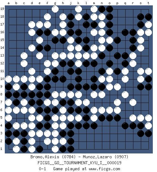 Last move : 0-1 2010 April 13 20:34:50 [Event "FICGS__GO__TOURNAMENT_KYU_I__000019"] [Site "FICGS"] [Date "2009.09.08"] [Round "1"] [Black "Bromo,Alexis"] [White "Munoz,Lazaro"] [Result "0-1"] [Rating 1 "0784"] [Rating 2 "0907"] 1.q16 d4 2.q4 d16 3.k10 d10 4.k16 q10 5.k4 r7 6.f14 d14 7.f6 d6 8.o8 r13 9.p13 s15 10.r16 s16 11.s17 h17 12.g17 g16 13.f16 f17 14.g18 e17 15.e16 d17 16.g15 h16 17.h15 h18 18.e9 d9 19.e11 e10 20.f10 f11 21.f9 f12 22.e12 e13 23.d12 c12 24.d13 c13 25.g11 d11 26.d8 g4 27.h5 g5 28.g6 h4 29.j4 n17 30.m17 m16 31.l17 n16 32.o16 o15 33.o17 n18 34.o18 g12 35.h12 h11 36.g10 h13 37.j12 j13 38.j11 j15 39.k15 k14 40.l15 l13 41.m12 m13 42.n13 n14 43.o14 m14 44.o12 o10 45.n11 n10 46.m10 p6 47.o5 o6 48.p5 m6 49.n5 n6 50.l5 k7 51.l6 l7 52.m7 m8 53.n7 n8 54.o7 p7 55.p8 q8 56.n9 o9 57.m9 p9 58.f4 f3 59.f5 e3 60.h3 g3 61.g2 h2 62.j3 f2 63.j2 g1 64.p15 n15 65.j16 j14 66.j17 g19 67.j18 f18 68.c8 b9 69.c9 c10 70.h10 s5 71.s4 r5 72.r4 b6 73.b7 c7 74.d7 c6 75.b8 b10 76.e6 e5 77.e4 d5 78.p11 q11 79.q12 r12 80.q13 h8 81.j7 j8 82.k9 k8 83.l9 h6 84.h7 j5 85.j6 h5 86.k6 a7 87.a8 a6 88.a9 a10 89.j1 m5 90.m4 e8 91.e7 k5 92.l4 g7 93.f8 g8 94.j9 k12 95.l12 m18 96.l18 k19 97.n19 m19 98.o19 k18 99.l14 g13 100.e14 e15 101.r14 s14 102.r15 t17 103.t18 t16 104.s18 t4 105.t3 t5 106.s3 f7 107.e8 o11 108.h1 g2 109.k11 k13 110.s9 s10 111.t10 t11 112.t9 s11 113.c3 d3 114.c2 b2 115.b3 b1 116.c1 b4 117.a4 a5 118.a3 c4 119.e1 d2 120.a2 d1 0-1 Here are the names of the openings (joseki) played in the four corners : Corner q4 : q4 r7 Hoshi (Hwajeom, Seongjeom, Xingwei`) 4-4 Point. The star or hoshi (4-4) point, emphasizing influence at the potential expense of territory. Niken Kakari (Dukan Keolch'im, E`r Gua`jiao~, 2-Space Low Approach). Black typically answers by 7-3 or 3-5 (which is not joseki). Corner d16 : d16 f14 Hoshi (Hwajeom, Seongjeom, Xingwei`) 4-4 Point. The star or hoshi (4-4) point, emphasizing influence at the potential expense of territory. Corner d4 : d4 f6 Hoshi (Hwajeom, Seongjeom, Xingwei`) 4-4 Point. The star or hoshi (4-4) point, emphasizing influence at the potential expense of territory. Corner q16 : q16 r13 Hoshi (Hwajeom, Seongjeom, Xingwei`) 4-4 Point. The star or hoshi (4-4) point, emphasizing influence at the potential expense of territory. Niken Kakari (Dukan Keolch'im, E`r Gua`jiao~, 2-Space Low Approach). Black typically answers by 7-3 or 3-5 (which is not joseki). Player White won this Go (weiqi, baduk) game. Follow this game move after move (download)Don't count territory held by only one eye. (Anonymous) In fact if nothing is done against this teddy bear, hereby I announce that I would quit chess, rapid chess, blitz chess, postal chess, email chess, server chess and correspondence chess I will then switch to a table game where teddy bears aren't going to be seen for a while, like Poker, or Roulette, all 18+ games. (Elmer Valderrama)