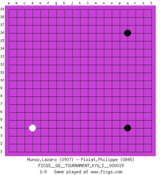 Last move : 1-0 2009 October 10 8:43:40 [Event "FICGS__GO__TOURNAMENT_KYU_I__000019"] [Site "FICGS"] [Date "2009.09.08"] [Round "1"] [Black "Munoz,Lazaro"] [White "Piolat,Philippe"] [Result "1-0"] [Rating 1 "0907"] [Rating 2 "0845"] 1.q16 d4 2.q4 1-0 This go game has been lost on time (started : 2009.09.08 11:11:29) Here are the names of the openings (joseki) played in the four corners : Corner q4 : q4 1-0 Hoshi (Hwajeom, Seongjeom, Xingwei`) 4-4 Point. The star or hoshi (4-4) point, emphasizing influence at the potential expense of territory. Player Black won this Go (weiqi, baduk) game. Follow this game move after move (download)The game plays itself, the players don't control it. (Pierre Audouard) Inventor: A person who makes an ingenious arrangement of wheels, levers and springs, and believes it civilization. (Ambrose Bierce, The Devil's Dictionary)