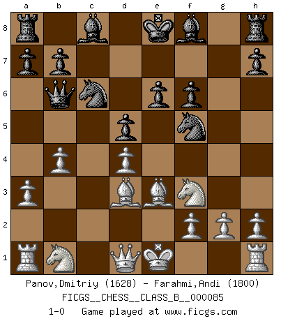 Last move : 1-0 2009 December 4 20:57:20 [Event "FICGS__CHESS__CLASS_B__000085"] [Site "FICGS"] [Date "2009.09.09"] [Round "1"] [White "Panov,Dmitriy"] [Black "Farahmi,Andi"] [Result "1-0"] [WhiteElo "1628"] [BlackElo "1800"] 1.e4 e6 2.d4 d5 3.e5 c5 4.c3 Nc6 5.Nf3 Nge7 6.a3 Nf5 7.b4 cxd4 8.cxd4 Qb6 9.Be3 f6 10.exf6 gxf6 11.Bd3 1-0 This chess game has been lost on time (started : 2009.09.09 8:43:55) French : Advance, Paulsen attack Player White won this chess game. Follow this game move after move (download)In Chess, at least, the brave inherit the earth. (Edmar Mednis) Stil? Ich habe keinen Stil! (Anatoly Karpov) ¿Que sería del Ajedrez sin errores graciosos?. (Kurt Richter) Seul un grand joueur sait à quel point il joue faiblement. (Xavier Tartacover) Man is reluctant to give credit for intelligence to anyone, except his enemies. (Albert Einstein)