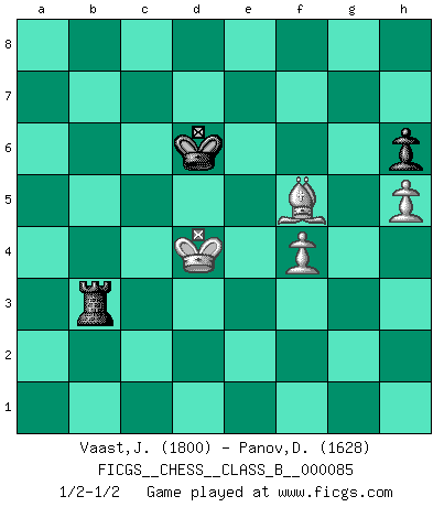 Last move : 1/2-1/2 2009 October 13 21:13:49 [Event "FICGS__CHESS__CLASS_B__000085"] [Site "FICGS"] [Date "2009.09.09"] [Round "1"] [White "Vaast,Jean-Philippe"] [Black "Panov,Dmitriy"] [Result "1/2-1/2"] [WhiteElo "1800"] [BlackElo "1628"] 1.c4 Nf6 2.g3 e6 3.Bg2 c5 4.Nf3 Nc6 5.Nc3 Be7 6.e4 d5 7.cxd5 exd5 8.e5 Ng4 9.h3 Ngxe5 10.Nxe5 Nxe5 11.Qe2 Nc6 12.Nxd5 O-O 13.Nxe7+ Nxe7 14.O-O Qc7 15.b3 Bf5 16.Bb2 Rad8 17.Rfe1 Nc6 18.Rac1 Nb4 19.Qf3 Qd7 20.Rxc5 Nd3 21.Qxf5 Qxf5 22.Rxf5 Nxe1 23.Bxb7 Rxd2 24.Bc3 Rd1 25.Kh2 Rfd8 26.Ba5 g6 27.Re5 Nd3 28.Re7 Rd6 29.Bg2 a6 30.Re8+ Kg7 31.Re2 Re6 32.Bf3 Rc1 33.Rd2 Rc5 34.Bd8 Ne1 35.Bb7 Rc2 36.Rxc2 Nxc2 37.Ba5 f6 38.Kg2 Nd4 39.Kf1 Re7 40.Ba8 Rd7 41.Ke1 g5 42.Bc3 Kg6 43.Be4+ f5 44.Bg2 Re7+ 45.Kd1 Nb5 46.Bd2 Nd6 47.Bf1 Ne4 48.Be1 Re6 49.Bc4 Rc6 50.Ke2 Kf6 51.f4 gxf4 52.gxf4 Nd6 53.Bd3 Nb5 54.Bc4 Nd6 55.Bd3 Ke6 56.Bb4 Rc1 57.h4 Rh1 58.Bxa6 Rh2+ 59.Ke3 Rxa2 60.Bd3 Rb2 61.Bxd6 Kxd6 62.Bxf5 Rxb3+ 63.Kd4 h6 64.h5 1/2-1/2 English, 1...Nf6 (Anglo-Indian defense) Kingside Castling by player Black (move 12) Kingside Castling by player White (move 14) 10 pieces endgame at move 61 : White KBBPPP , Black KRPP WHITE : King + 2 Bishops 3 Pawns BLACK : King + 1 Rook 2 Pawns 9 pieces endgame at move 61 : White KBPPP , Black KRPP WHITE : King + 1 Bishop 3 Pawns BLACK : King + 1 Rook 2 Pawns 8 pieces endgame at move 62 : White KBPPP , Black KRP WHITE : King + 1 Bishop 3 Pawns BLACK : King + 1 Rook 1 Pawn 7 pieces endgame at move 62 : White KBPP , Black KRP WHITE : King + 1 Bishop 2 Pawns BLACK : King + 1 Rook 1 Pawn This chess game ended in a draw. Follow this game move after move (download)There is only one thing Fischer does in Chess without pleasure: to lose ! (Boris Spassky) Ich habe Putins Aufstieg an die Macht beobachtet und seine Politik, die demokratischen Institutionen meines Landes zu zerstören. (Garry Kasparov) Alguna parte de un error es siempre correcto. (Savielly Tartakover) Ne tendez aucun piège pour le plaisir ! Ne jouez rien dans l'espoir que l'adversaire réagisse de façon stupide ! Prenez toujours pour acquis que l'adversaire va trouver le meilleur coup ! Ne jouez jamais de coup dans l'espoir que l'adversaire ne voie pas la menace ! Chacun de vos coups doit améliorer la position d'une façon ou d'une autre. We cannot be sure of having something to live for unless we are willing to die for it. (Ernesto Che Guevara)